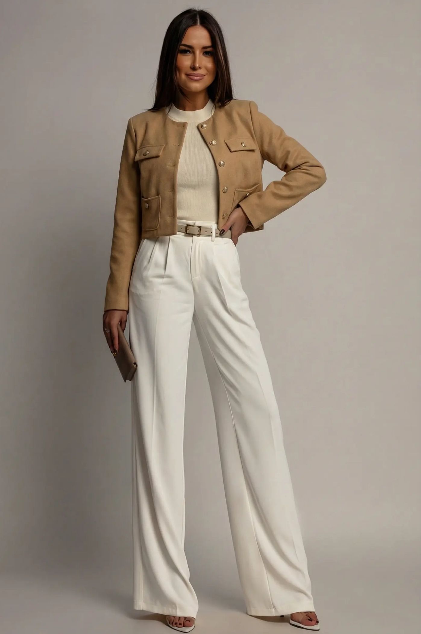 Ανακαλύψτε το απόλυτο must-have κομμάτι της σεζόν ένα κοντό σακάκι (cropped blazer) που συνδυάζει την κλασική γραμμή με μοντέρνες λεπτομέρειες. Το κοντό μήκος του αναδεικνύει τη μέση και ταιριάζει τέλεια με ψηλόμεσα παντελόνια και φούστες. Διαθέτει χρυσά κουμπιά που προσδίδουν αριστοκρατικό αέρα και λάμψη. Η στρογγυλή λαιμόκοψη (collarless design) προσφέρει ένα καθαρό, minimal αποτέλεσμα. Τέσσερις διακοσμητικές τσέπες στο μπροστινό μέρος που ενισχύουν το structure του ρούχου.