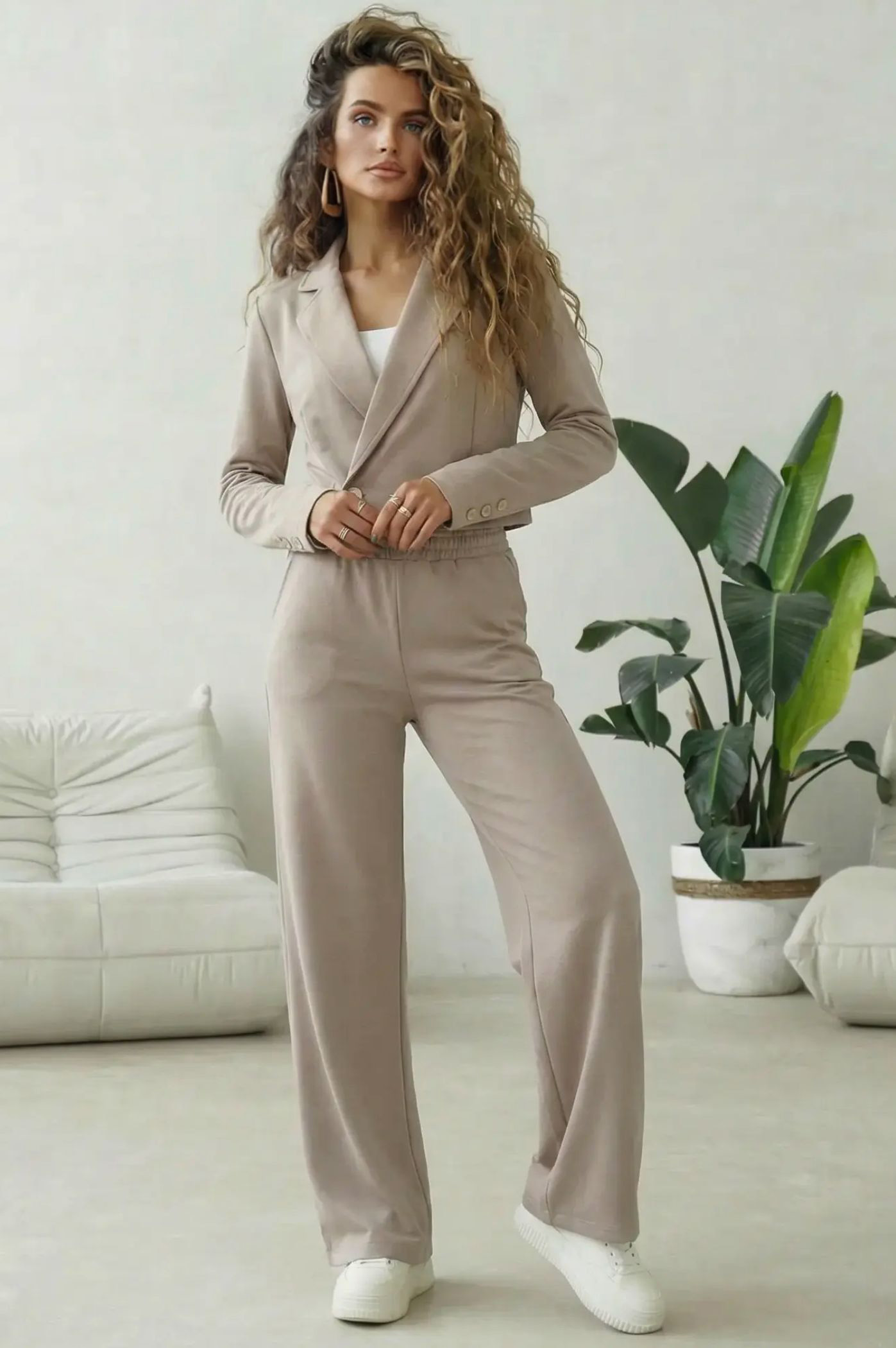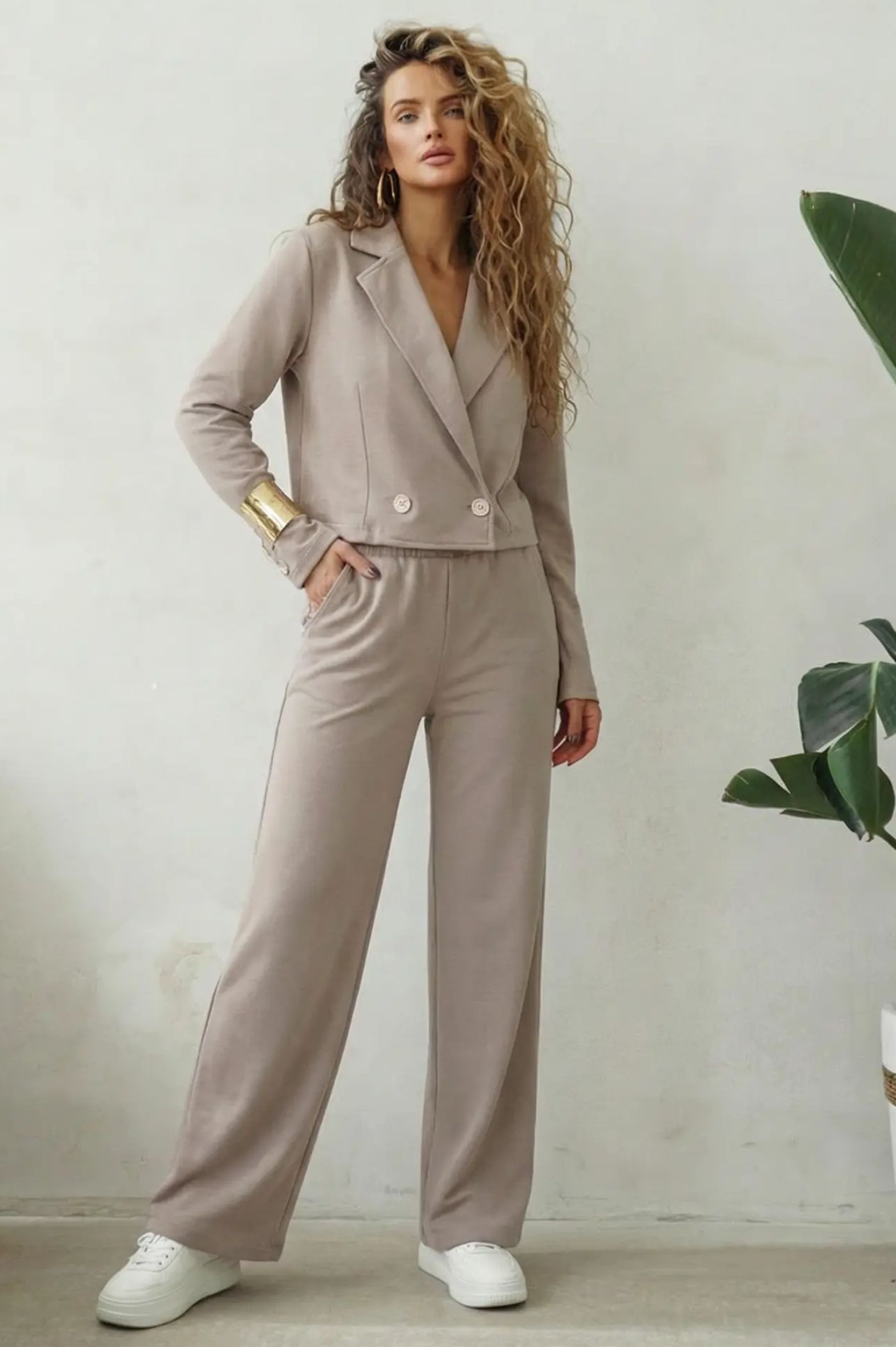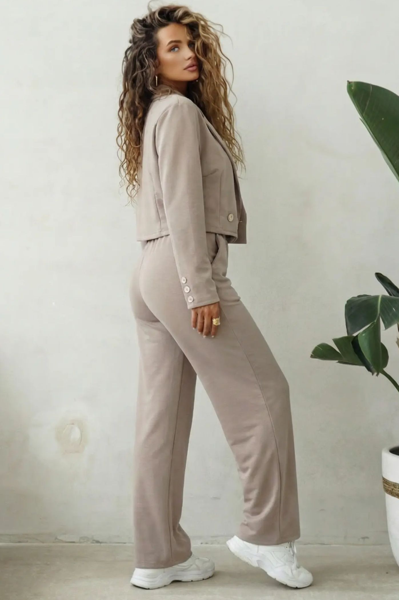 Συνδύασε την άνεση μιας φόρμας με το στυλ ενός κοστουμιού. Αυτό το σετ δύο τεμαχίων από premium, απαλό ύφασμα φόρμας που αγκαλιάζει το σώμα προσφέροντας απόλυτη ελευθερία κινήσεων. Διαθέτει κομψό σακάκι σε cropped γραμμή με κλασικό πέτο και κουμπιά που προσθέτουν μια tailored πινελιά στο look και παντελόνι με τσέπες και λάστιχο στη μέση. Ένα ευέλικτο σύνολο που αποπνέει αβίαστη φινέτσα, ιδανικό για να σας συνοδεύσει από τις πρωινές υποχρεώσεις μέχρι τις απογευματινές σας βόλτες με απαράμιλλο στυλ.