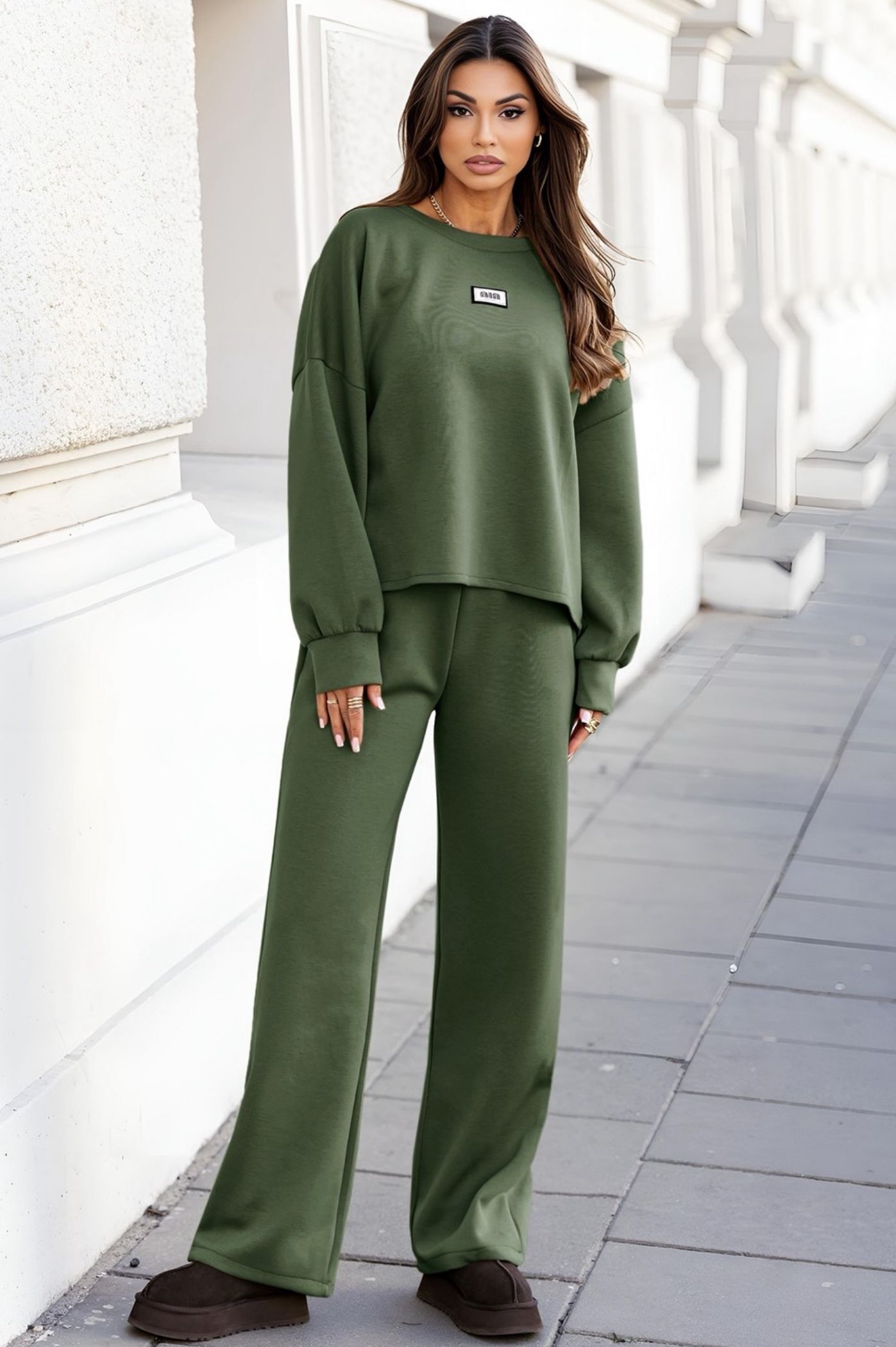 Απολαύστε την απόλυτη άνεση χωρίς συμβιβασμούς στο στυλ με αυτό το μοντέρνο σετ φόρμας φούτερ. Ιδανικό για loungewear στο σπίτι, αλλά και για trendy casual εμφανίσεις στην πόλη. Η μπλούζα με oversized γραμμή και στρογγυλή λαιμόκοψη. Το φούτερ είναι μακρυμάνικο με μανσέτες και διαθέτει ένα διακριτικό λογότυπο στο στήθος, προσθέτοντας μια athleisure πινελιά. Το παντελόνι σε ίσια γραμμή, η οποία είναι η τελευταία τάση στη μόδα. Διαθέτει λάστιχο στη μέση για τέλεια εφαρμογή και άνεση. Μπορεί να φορεθεί με chunky sneakers ή άνετα μποτάκια για ένα ολοκληρωμένο, στυλάτο σύνολο.