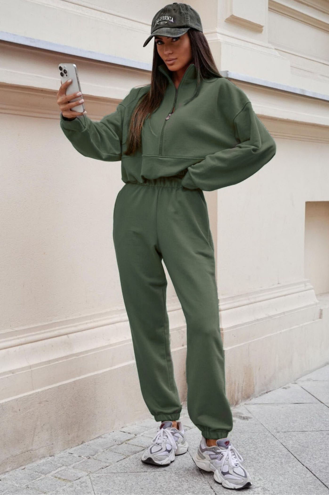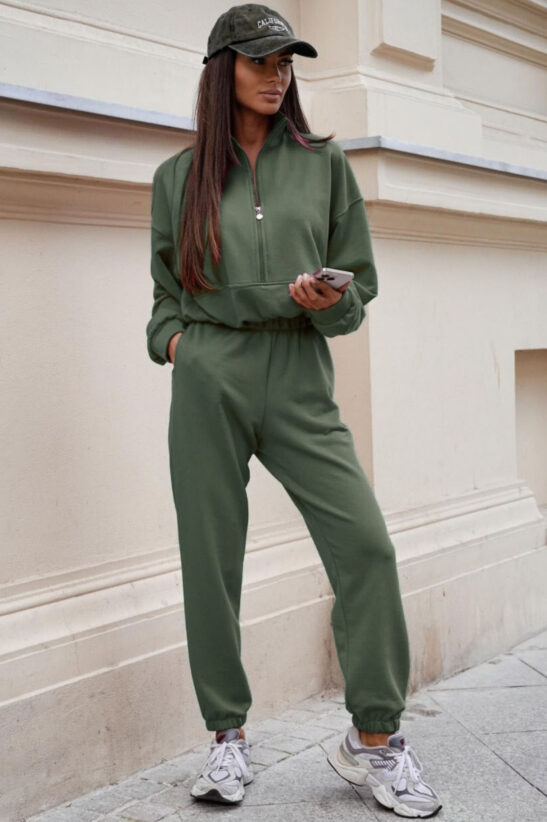 Αναδείξτε το στυλ σας με αυτό το άνετο και στιλάτο σετ φόρμας. Η μπλούζα διαθέτει ψηλό γιακά και μικρό φερμουάρ (half zip) για εύκολη εφαρμογή και μοντέρνο sporty look. Η χαλαρή της γραμμή προσφέρει άνεση και ελευθερία κινήσεων. Το παντελόνι έχει χαλαρή εφαρμογή και λάστιχο στη μέση και τους αστραγάλους, εξασφαλίζοντας τέλεια εφαρμογή και αναδεικνύοντας τα sneakers σας. Φορέστε το ολόκληρο για τις προπονήσεις σας, τις βόλτες ή τις στιγμές χαλάρωσης στο σπίτι. Μπορείτε επίσης να συνδυάσετε την μπλούζα με ένα τζιν ή το παντελόνι με ένα crop top, δημιουργώντας διαφορετικά, ξεχωριστά outfits.