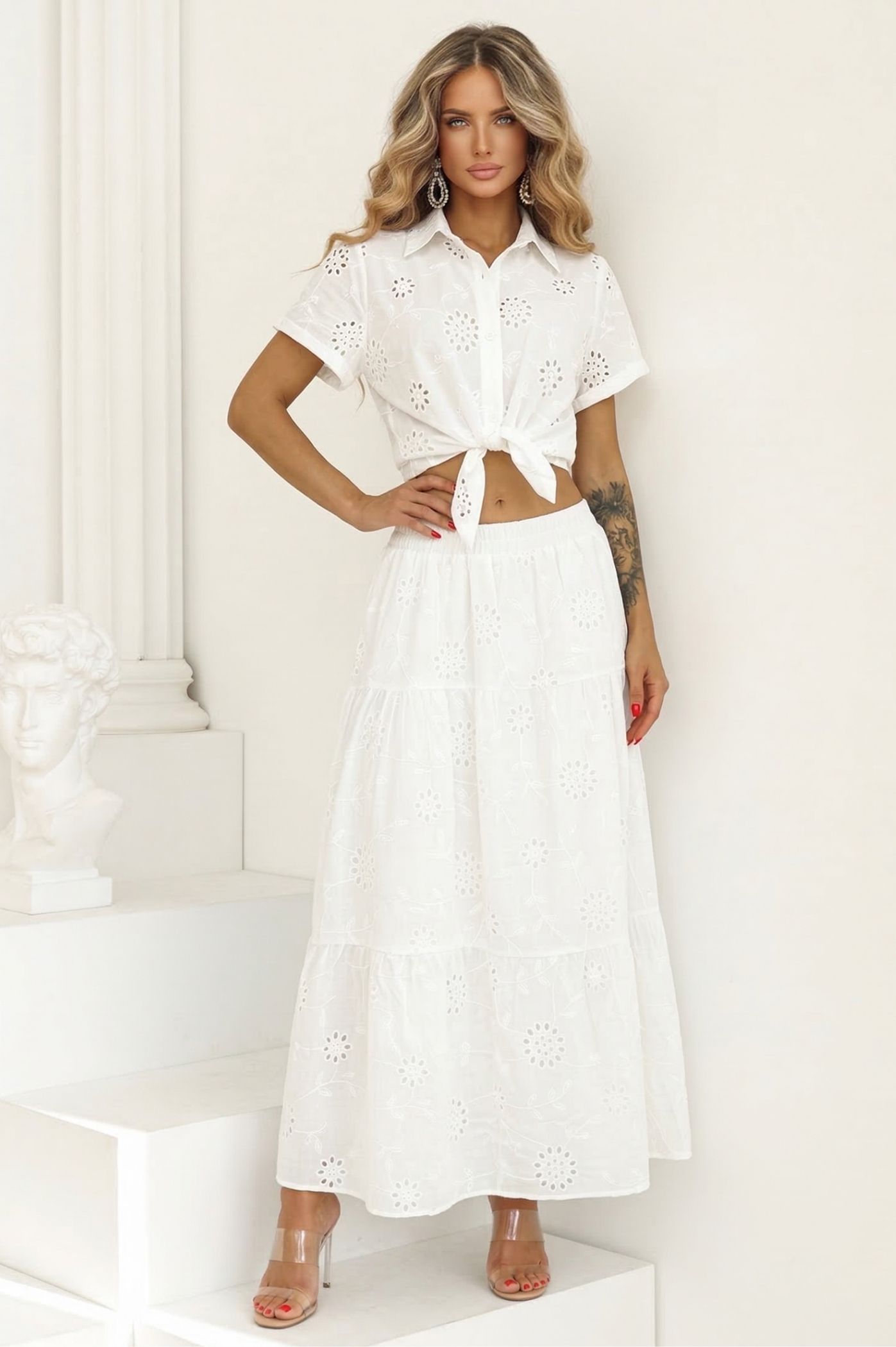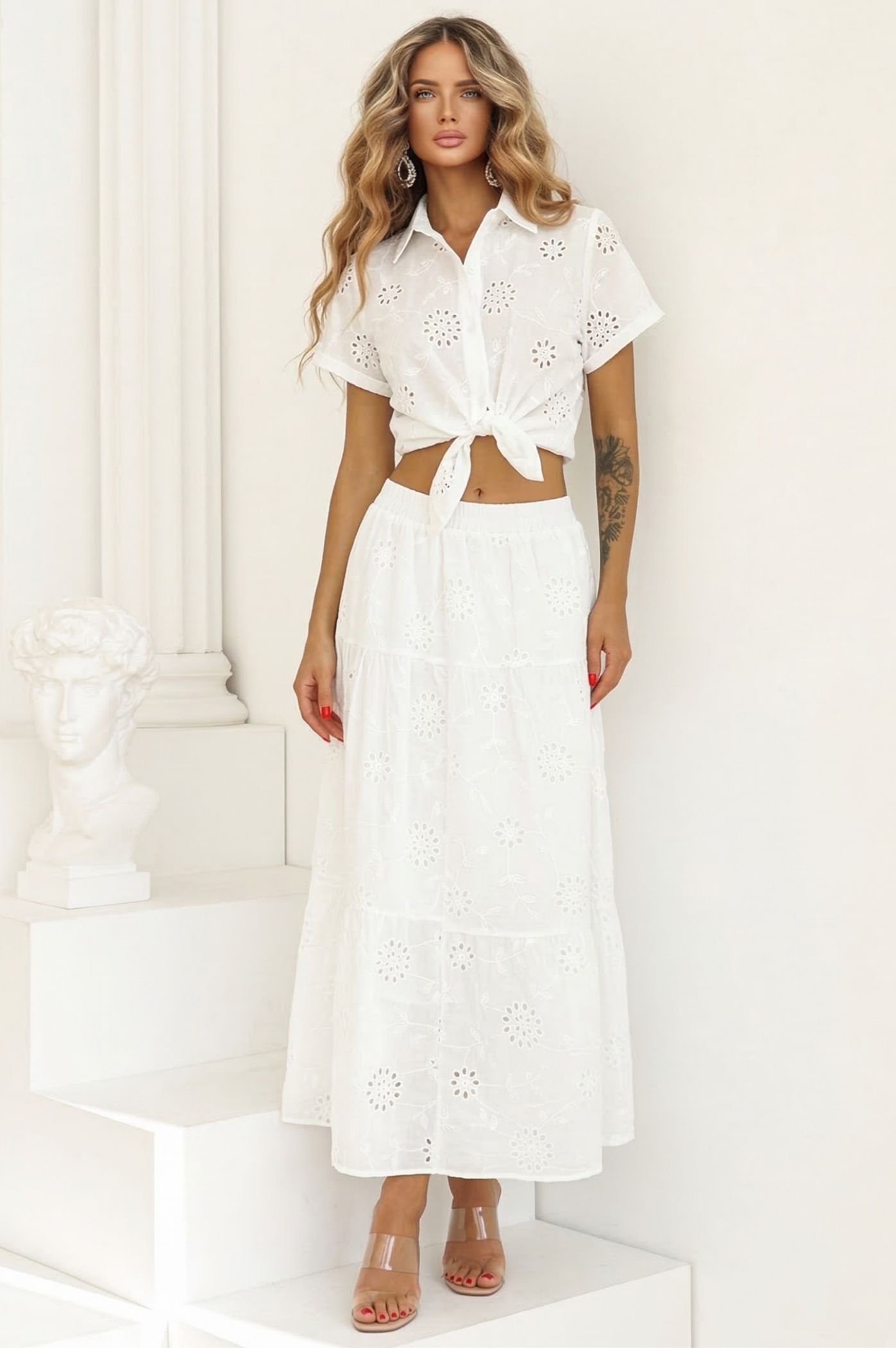 Αναβαθμίστε την καλοκαιρινή σας γκαρνταρόμπα με αυτό το εντυπωσιακό σετ δύο τεμαχίων. Κατασκευασμένο από υψηλής ποιότητας ύφασμα με κεντητές λεπτομέρειες (kipour), το σύνολο αυτό προσφέρει έναν αέρα ρομαντισμού και πολυτέλειας, ιδανικό για τις πρωινές αλλά και τις βραδινές σας εμφανίσεις. Κοντομάνικο πουκάμισο σε cropped γραμμή που δένει κομψά μπροστά, αναδεικνύοντας τη μέση. Διαθέτει κλασικό γιακά και διακριτικά κουμπιά.Maxi φούστα σε γραμμή tiered (βολάν) που προσφέρει κίνηση και άνεση. Η ελαστική μέση εξασφαλίζει τέλεια εφαρμογή σε κάθε σωματότυπο. Δροσερό και ελαφρύ, με περίτεχνα eyelet κεντήματα που επιτρέπουν στο δέρμα να αναπνέει.