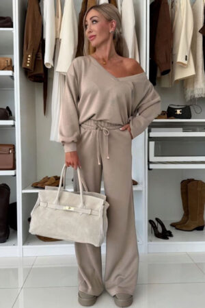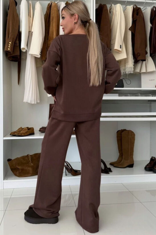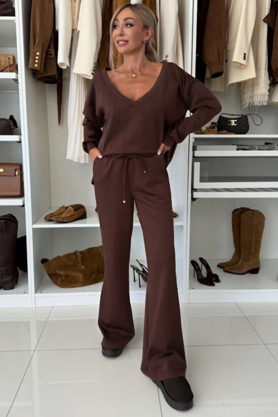 Αναδείξτε την καθημερινή σας άνεση με το απόλυτο leisurewear set. Αυτό το κομψό σετ φόρμας είναι η επιτομή του casual chic, προσφέροντας αβίαστο στυλ από το πρωί μέχρι το βράδυ. Το σετ αποτελείται από μια μπλούζα V-ντεκολτέ με χαλαρή γραμμή και ένα παντελόνι καμπάνα με άνετο λάστιχο στη μέση. Το μαλακό ύφασμα αγκαλιάζει το σώμα, εξασφαλίζοντας μέγιστη ελευθερία κινήσεων και απαράμιλλη άνεση. Μπορεί να φορεθεί για άνεση στο σπίτι, τηλεργασία ή συνδυάστε το με μπότες και κοσμήματα για ένα statement athleisure look στις εξόδους σας.