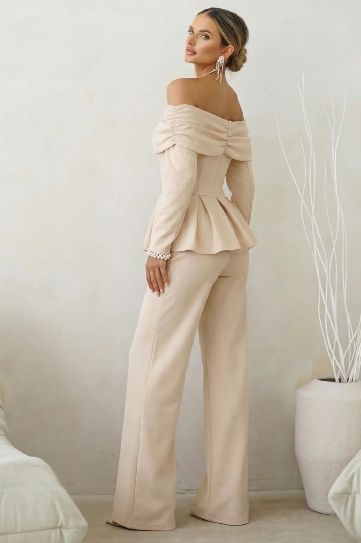 ΣET OFF-SHOULDER PEPLUM TOP ΚΑΙ ΠΑΝΤΕΛΟΝΙ – ΜΠΕΖ