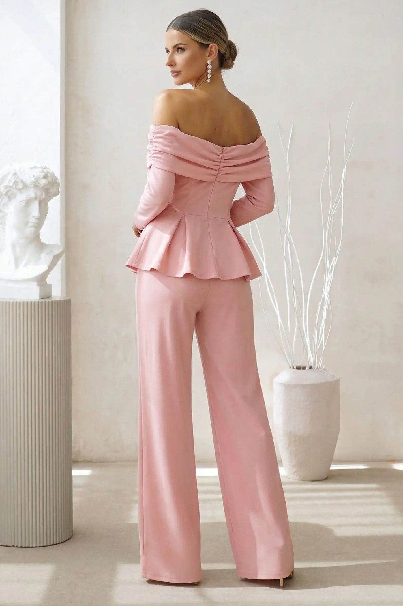 ΣET OFF-SHOULDER PEPLUM TOP ΚΑΙ ΠΑΝΤΕΛΟΝΙ – ΡΟΖ