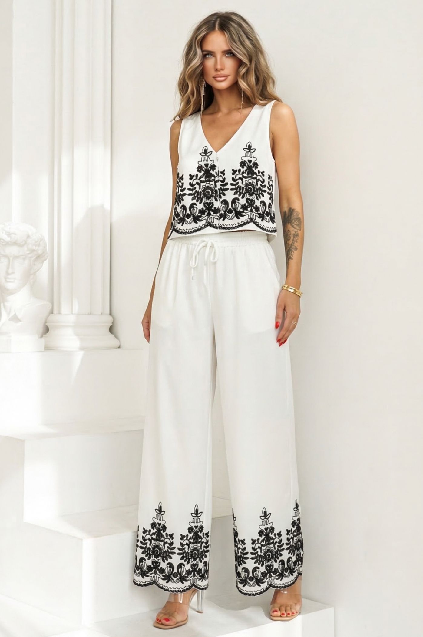 Ανακαλύψτε την απόλυτη ισορροπία ανάμεσα στο modern chic και το παραδοσιακό στυλ με αυτό το σετ δύο τεμαχίων. Ένας συνδυασμός που αποπνέει αυτοπεποίθηση και κομψότητα, ιδανικός για τις εμφανίσεις σας στην πόλη ή το νησί. Το κέντημα με φολκλόρ και floral μοτίβα δημιουργεί μια έντονη αντίθεση πάνω ύφασμα, δίνοντας μια luxury boho αίσθηση στο τελείωμα του γιλέκου και της παντελόνας. Το αμάνικο γιλέκο σε crop γραμμή διαθέτει κομψή V λαιμόκοψη και μικρά κουμπιά στο μπροστινό μέρος, ακολουθώντας την κορυφαία τάση της σεζόν. Η αέρινη, φαρδιά παντελόνα με λάστιχο στη μέση προσφέρει μέγιστη άνεση και ελευθερία κινήσεων, ενώ κολακεύει και επιμηκύνει τη σιλουέτα. Το ύφασμα είναι ελαφρύ και δροσερό, κάνοντας το σετ κατάλληλο για ολοήμερη χρήση, από ένα επαγγελματικό ραντεβού μέχρι ένα βραδινό cocktail.