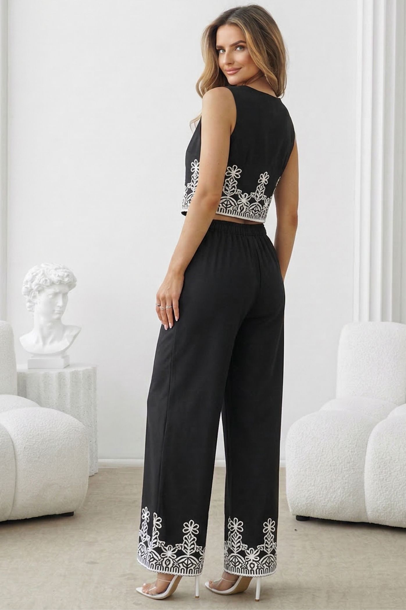 Ανακαλύψτε την απόλυτη ισορροπία ανάμεσα στο modern chic και το παραδοσιακό στυλ με αυτό το σετ δύο τεμαχίων. Ένας συνδυασμός που αποπνέει αυτοπεποίθηση και κομψότητα, ιδανικός για τις εμφανίσεις σας στην πόλη ή το νησί. Το κέντημα με φολκλόρ και floral μοτίβα δημιουργεί μια έντονη αντίθεση πάνω ύφασμα, δίνοντας μια luxury boho αίσθηση στο τελείωμα του γιλέκου και της παντελόνας. Το αμάνικο γιλέκο σε crop γραμμή διαθέτει κομψή V λαιμόκοψη και μικρά κουμπιά στο μπροστινό μέρος, ακολουθώντας την κορυφαία τάση της σεζόν. Η αέρινη, φαρδιά παντελόνα με λάστιχο στη μέση προσφέρει μέγιστη άνεση και ελευθερία κινήσεων, ενώ κολακεύει και επιμηκύνει τη σιλουέτα. Το ύφασμα είναι ελαφρύ και δροσερό, κάνοντας το σετ κατάλληλο για ολοήμερη χρήση, από ένα επαγγελματικό ραντεβού μέχρι ένα βραδινό cocktail.