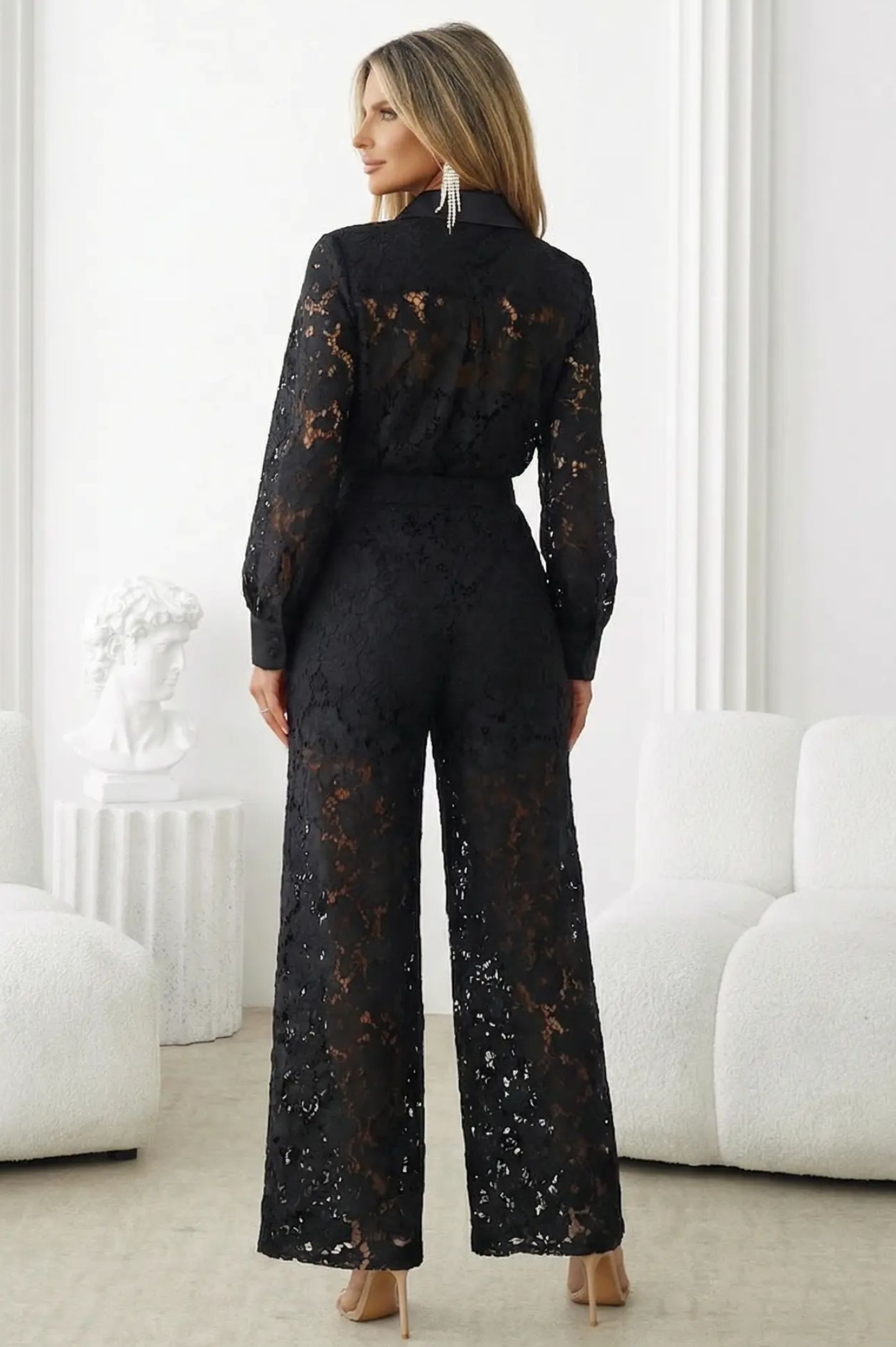Αναδείξτε κάθε σας επίσημη εμφάνιση με αυτό το πολυτελές σετ δύο τεμαχίων. Το σετ αυτό προσφέρει μια σοφιστικέ εναλλακτική στο κλασικό βραδινό φόρεμα. Πουκάμισο με διάφανη δαντέλα και floral μοτίβα χωρίς τοπάκι. Γιακάς, πατιλέτα και μανσέτες από ύφασμα για μια δόση διακριτικής λάμψης και σταθερότητας. Κομψά μανίκια που καταλήγουν σε σταθερές μανσέτες, προσφέροντας ένα luxury τελείωμα. Παντελόνι σε φαρδιά, άνετη γραμμή που χαρίζει ύψος και κίνηση. Τονίζει τη μέση και κολακεύει τη σιλουέτα. Διαθέτει κοντή φόδρα τύπου shorts για κάλυψη, αφήνοντας το υπόλοιπο πόδι να διαγράφεται πίσω από τη δαντέλα με έναν sexy αλλά chic τρόπο.