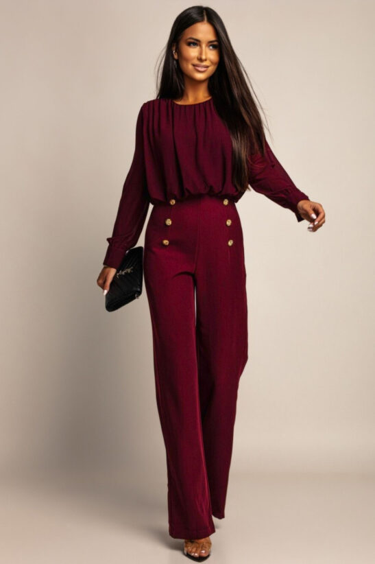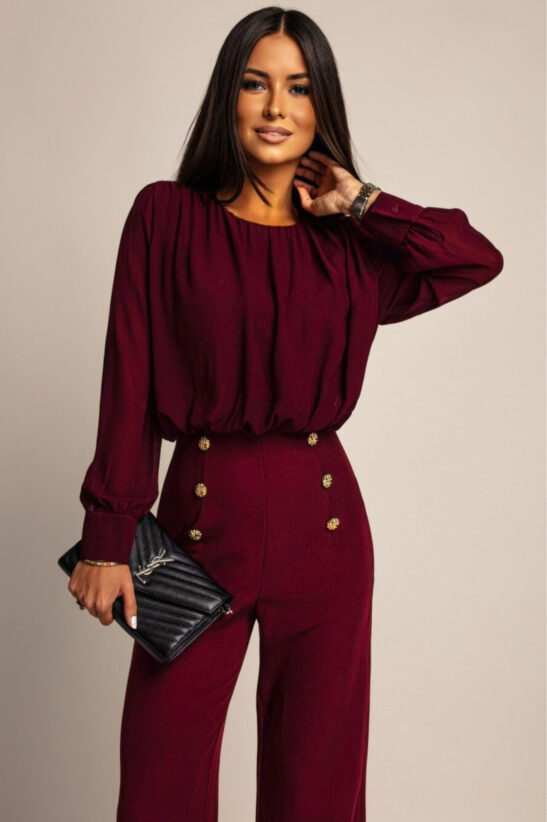 Αν ψάχνεις ένα σετ που αποπνέει κομψότητα και δυναμισμό, μόλις το βρήκες. Αυτό το σύνολο είναι η τέλεια επιλογή για εμφανίσεις που συνδυάζουν στιλ και άνεση. Η μπλούζα με αέρινη διαφάνεια στα μανίκια προσθέτει μια διακριτική θηλυκότητα, ενώ το ψηλόμεσο παντελόνι με τα εντυπωσιακά χρυσά κουμπιά κολακεύει τη σιλουέτα και χαρίζει αρχοντικό ύφος.
