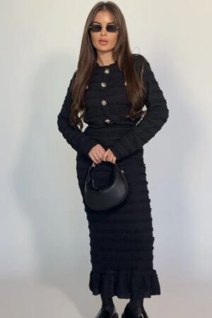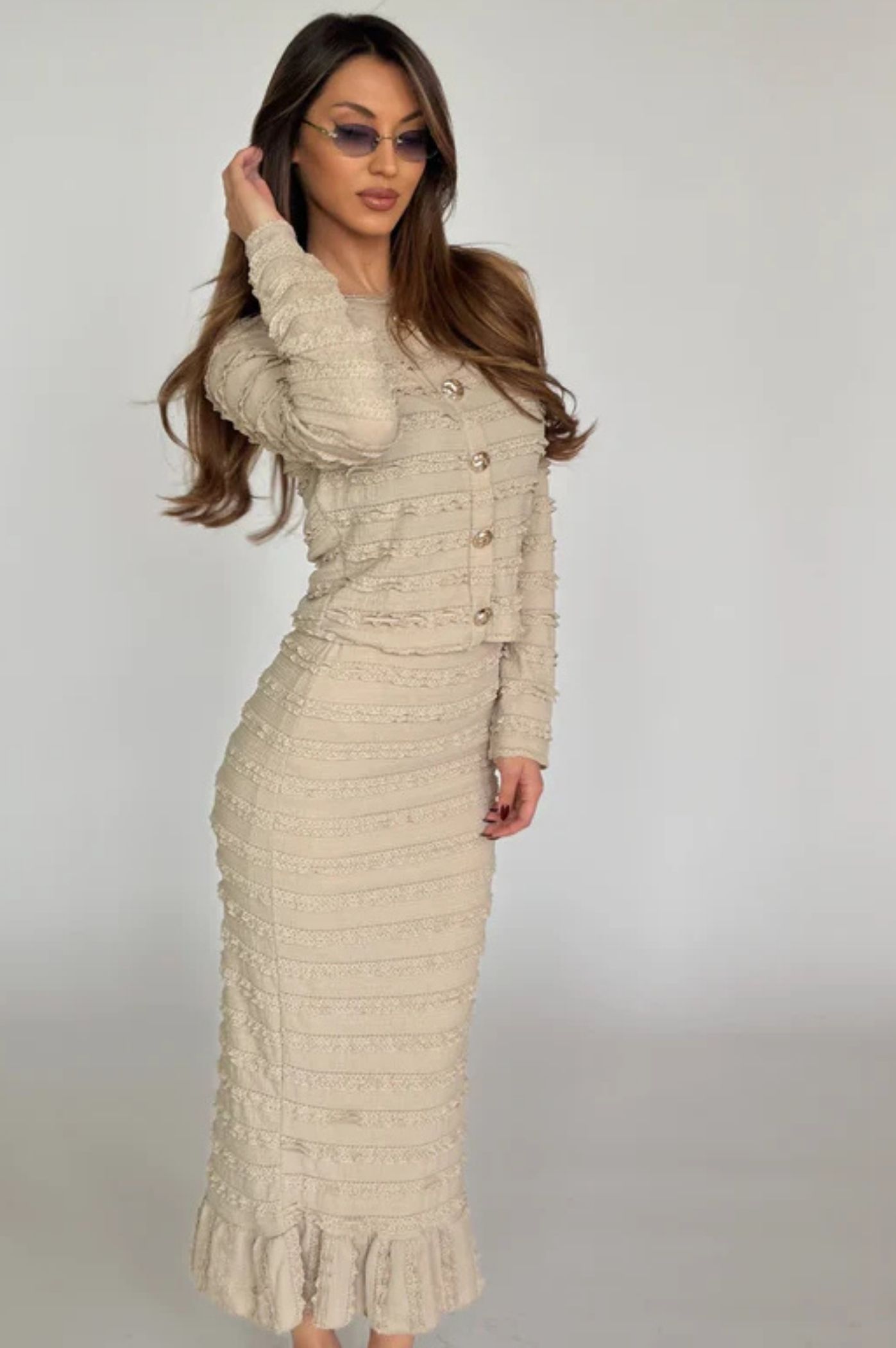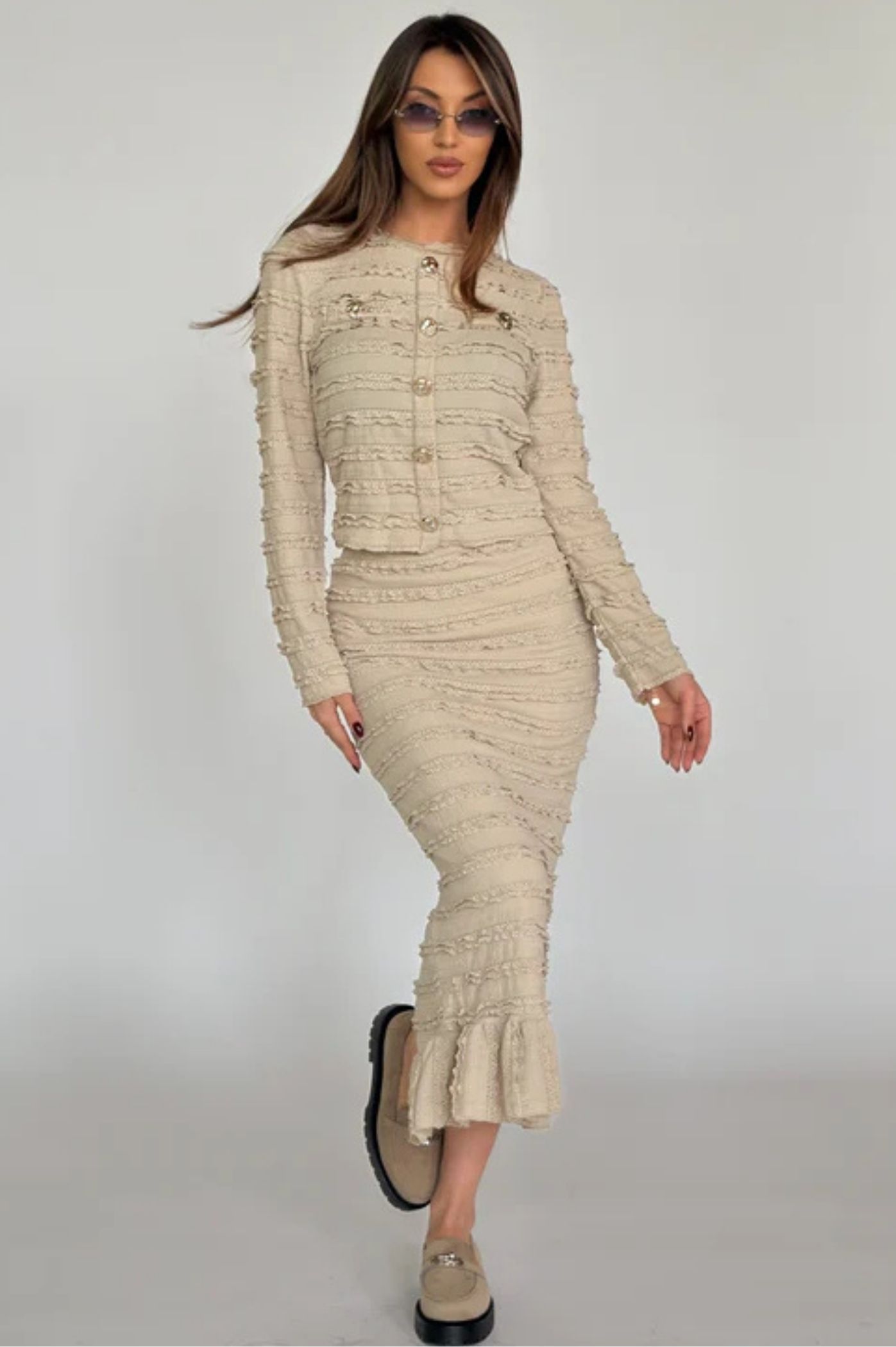 Αναδείξτε το στυλ σας με αυτό το πλεκτό σετ. Είναι η ιδανική επιλογή για εμφανίσεις που αποπνέουν διακριτική πολυτέλεια και σοφιστικέ αέρα. Το σετ αποτελείται από δύο κομμάτια, από μια μίντι φούστα σε στενή γραμμή που αγκαλιάζει τη σιλουέτα, διαθέτει διακριτικό πλεκτό μοτίβο σε οριζόντιες λωρίδες και τελειώνει σε κομψό βολάν στο κάτω μέρος. κι ένα κοντό ζακετάκι με την ίδια ανάγλυφη πλέξη με τη φούστα, δημιουργώντας ένα απόλυτα ομοιογενές και preppy αποτέλεσμα. Το ύφασμα είναι ελαστικό πλεκτό, προσφέροντας άνεση και άψογη εφαρμογή. Μπορεί να φορεθεί μαζί για ένα total chic look ή χωριστά, συνδυάζοντας το ζακετάκι με τζιν και τη φούστα με ένα απλό τοπ.