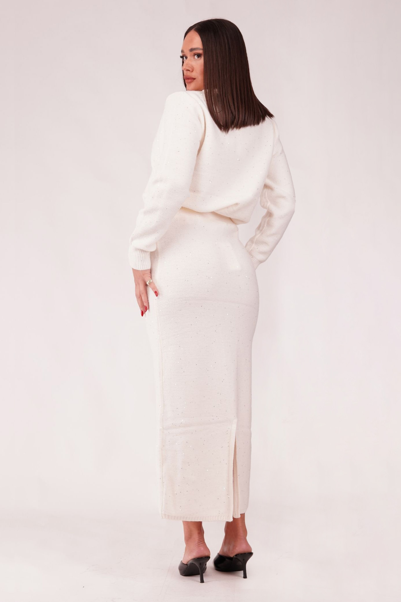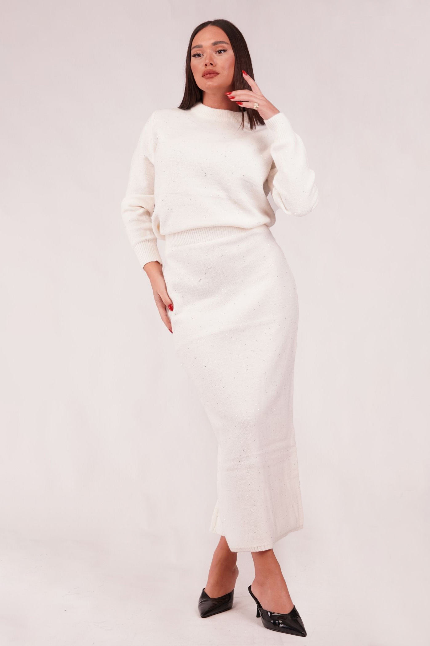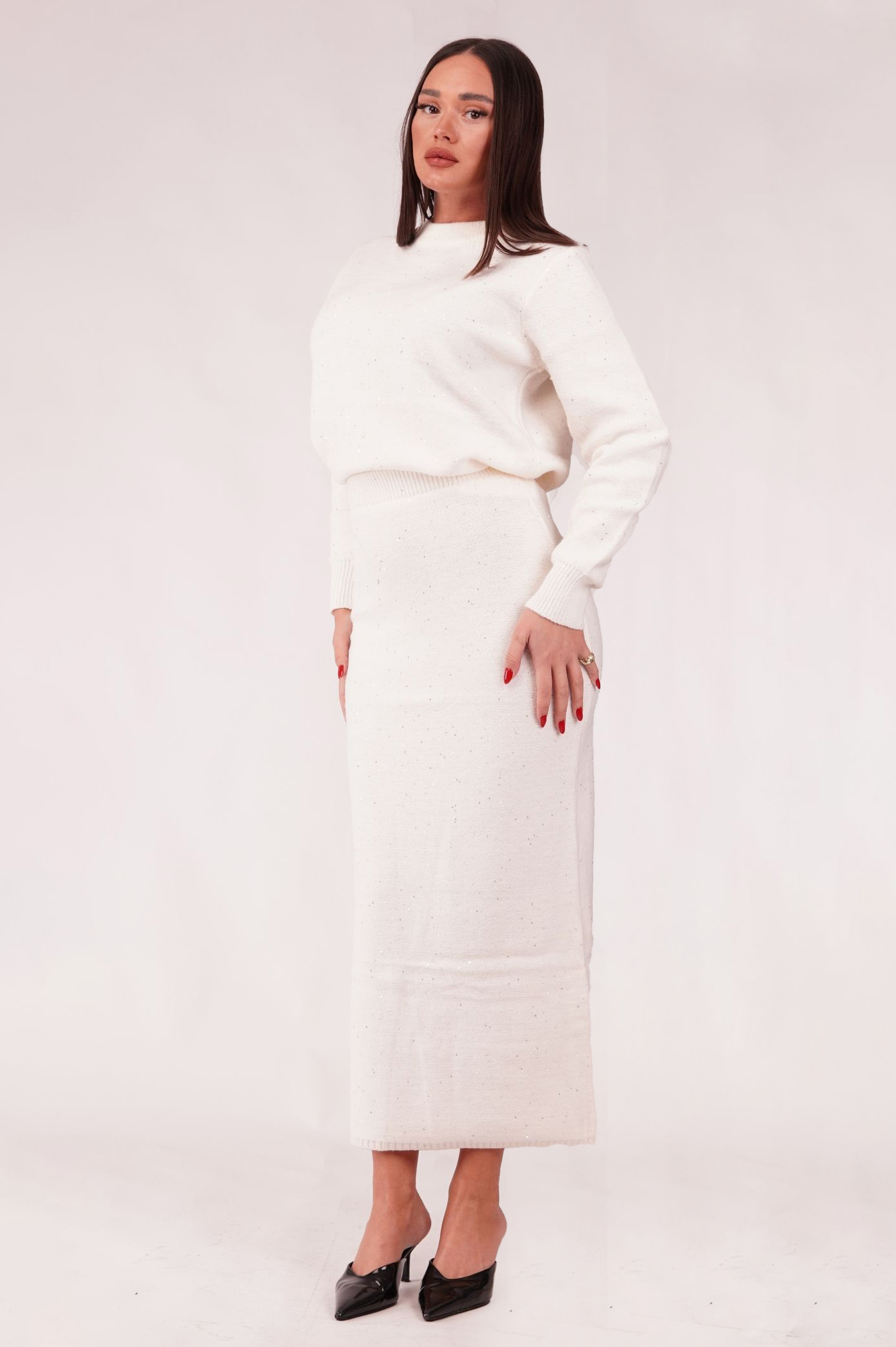 Αναβάθμισε το χειμερινό σου στιλ με αυτό το υπέροχο πλεκτό σετ, ιδανικό για τις γιορτές και κάθε ιδιαίτερη περίσταση. Το σύνολο περιλαμβάνει μακρυμάνικη μπλούζα και ψηλόμεση μακριά φούστα, διακοσμημένα με διακριτικές παγιέτες που προσθέτουν λάμψη χωρίς υπερβολές. Η ελαστική εφαρμογή αγκαλιάζει το σώμα κολακευτικά, ενώ το μαλακό ύφασμα προσφέρει ζεστασιά και άνεση. Συνδύασέ το εύκολα με ψηλοτάκουνα για βραδινές εμφανίσεις ή με μποτάκια για πιο χαλαρό chic look. Ένα διαχρονικό outfit που θα σε βγάλει ασπροπρόσωπη σε κάθε χριστουγεννιάτικο event, ρεβεγιόν ή χειμερινό κάλεσμα.
