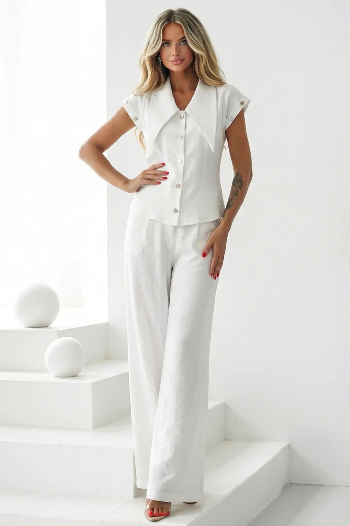Αναδείξτε την γκαρνταρόμπα σας με αυτό το απόλυτα chic σετ δύο τεμαχίων. Διαθέτει εντυπωσιακό, μεγάλο μυτερό γιακά και σειρά από κομψά κουμπιά, προσδίδοντας έναν αέρα υψηλής ραπτικής. Σε ίσια, άνετη γραμμή που επιμηκύνει τη σιλουέτα και προσφέρει ελευθερία κινήσεων. Δροσερό και αέρινο, ιδανικό για τις υψηλές θερμοκρασίες, με τη χαρακτηριστική υφή που αποπνέει διακριτική πολυτέλεια. Το πουκάμισο διαθέτει διακριτικά κουμπιά στους ώμους, ενισχύοντας τον δομημένο χαρακτήρα του set.