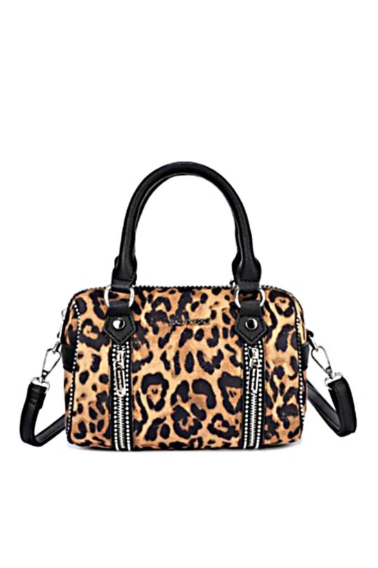 Προσθέστε μια ροκ πινελιά στις εμφανίσεις σας με αυτή τη μοναδική τσάντα χειρός σε leopard. Ο τέλειος συνδυασμός του κλασικού animal print με μοντέρνα στοιχεία, αυτή η τσάντα είναι το απόλυτο statement αξεσουάρ. Το ιδιαίτερο της σχήμα σε στυλ barrel και οι εντυπωσιακές μεταλλικές λεπτομέρειες με στρας στα φερμουάρ της, της προσδίδουν έναν ιδιαίτερο χαρακτήρα. Διαθέτει κοντά χερούλια για να τη κρατάτε στο χέρι, καθώς και ένα αποσπώμενο λουράκι ώμου για άνετη χρήση ως crossbody. Ευρύχωρη και πρακτική παρά το μικρό της μέγεθος, είναι η ιδανική επιλογή για τις βραδινές σας εξόδους ή για να αναβαθμίσετε ένα casual look.