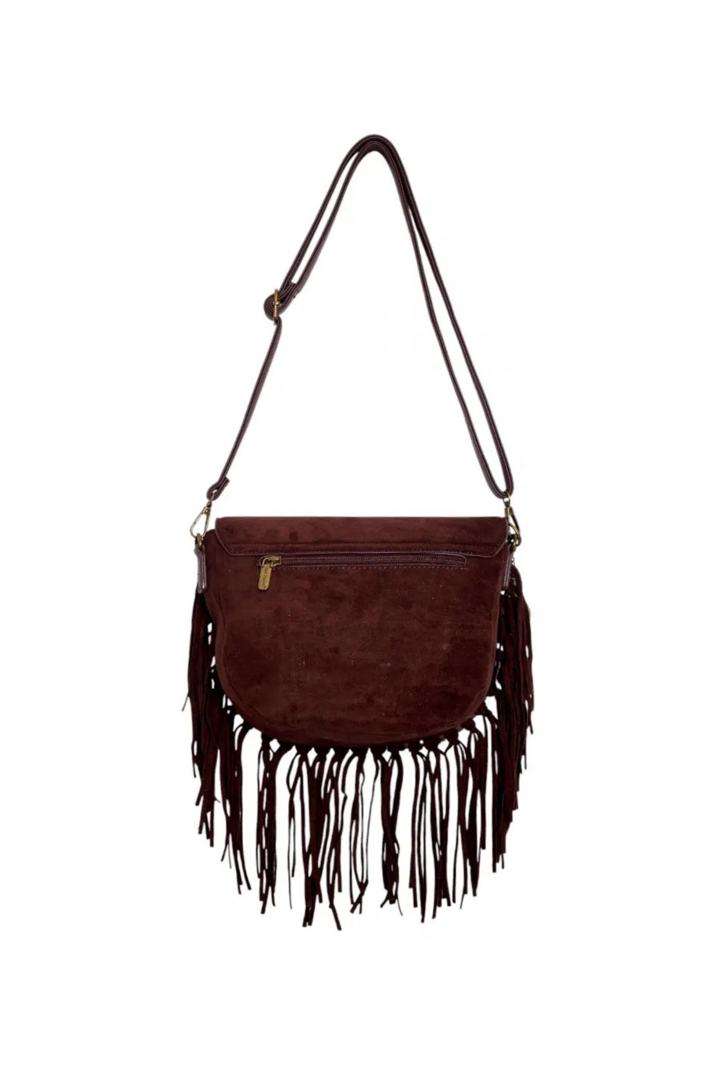 Ανακάλυψε τη μοναδική γυναικεία καστόρινη τσάντα χιαστή, ιδανική για boho και casual εμφανίσεις. Κατασκευασμένη από απαλό καστόρι υψηλής ποιότητας, προσφέρει κομψότητα και στυλ σε κάθε σύνολο. Η μπροστινή της όψη διακοσμείται με μεταλλικά τρουκς σε σχηματισμούς και πλούσια κρόσσια, χαρίζοντας κίνηση και ιδιαίτερο χαρακτήρα στο σχέδιο. Η τσάντα διαθέτει μακρύ, ρυθμιζόμενο λουρί για άνετη εφαρμογή χιαστή, καθώς και ευρύχωρη εσωτερική θήκη που επιτρέπει την οργάνωση των προσωπικών σου αντικειμένων. Αποτελεί την τέλεια επιλογή για καθημερινές βόλτες, φεστιβάλ ή για όποια στιγμή θέλεις να δώσεις μια bohemian πινελιά στο outfit σου.