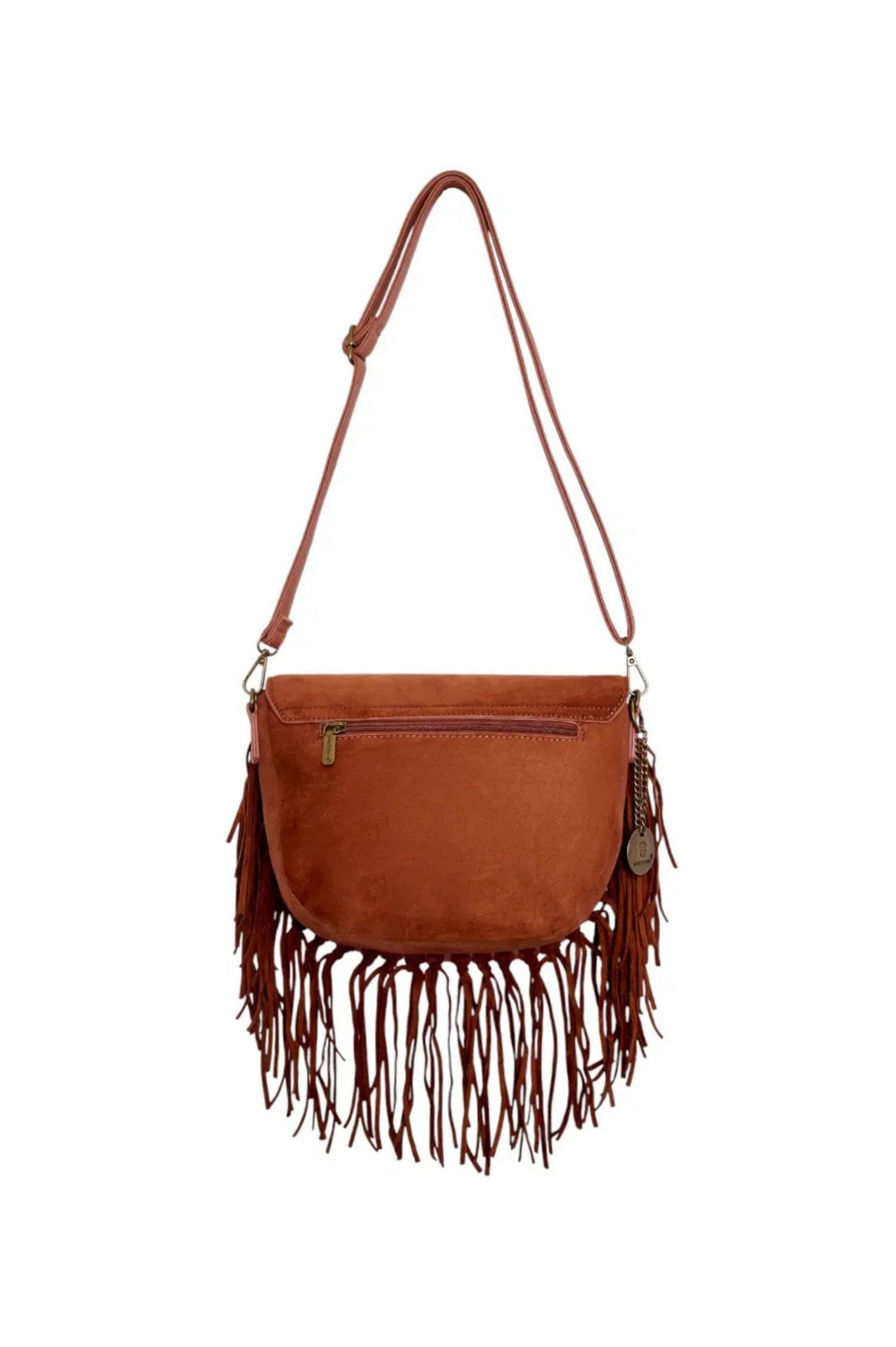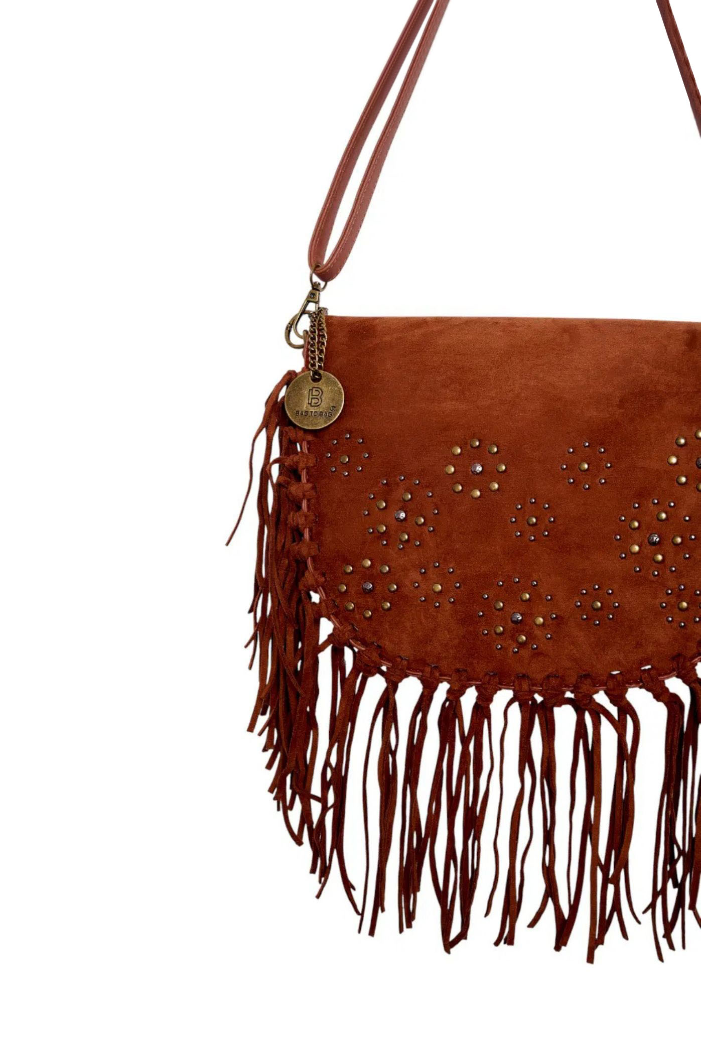 Ανακάλυψε τη μοναδική γυναικεία καστόρινη τσάντα χιαστή, ιδανική για boho και casual εμφανίσεις. Κατασκευασμένη από απαλό καστόρι υψηλής ποιότητας, προσφέρει κομψότητα και στυλ σε κάθε σύνολο. Η μπροστινή της όψη διακοσμείται με μεταλλικά τρουκς σε σχηματισμούς και πλούσια κρόσσια, χαρίζοντας κίνηση και ιδιαίτερο χαρακτήρα στο σχέδιο. Η τσάντα διαθέτει μακρύ, ρυθμιζόμενο λουρί για άνετη εφαρμογή χιαστή, καθώς και ευρύχωρη εσωτερική θήκη που επιτρέπει την οργάνωση των προσωπικών σου αντικειμένων. Αποτελεί την τέλεια επιλογή για καθημερινές βόλτες, φεστιβάλ ή για όποια στιγμή θέλεις να δώσεις μια bohemian πινελιά στο outfit σου.