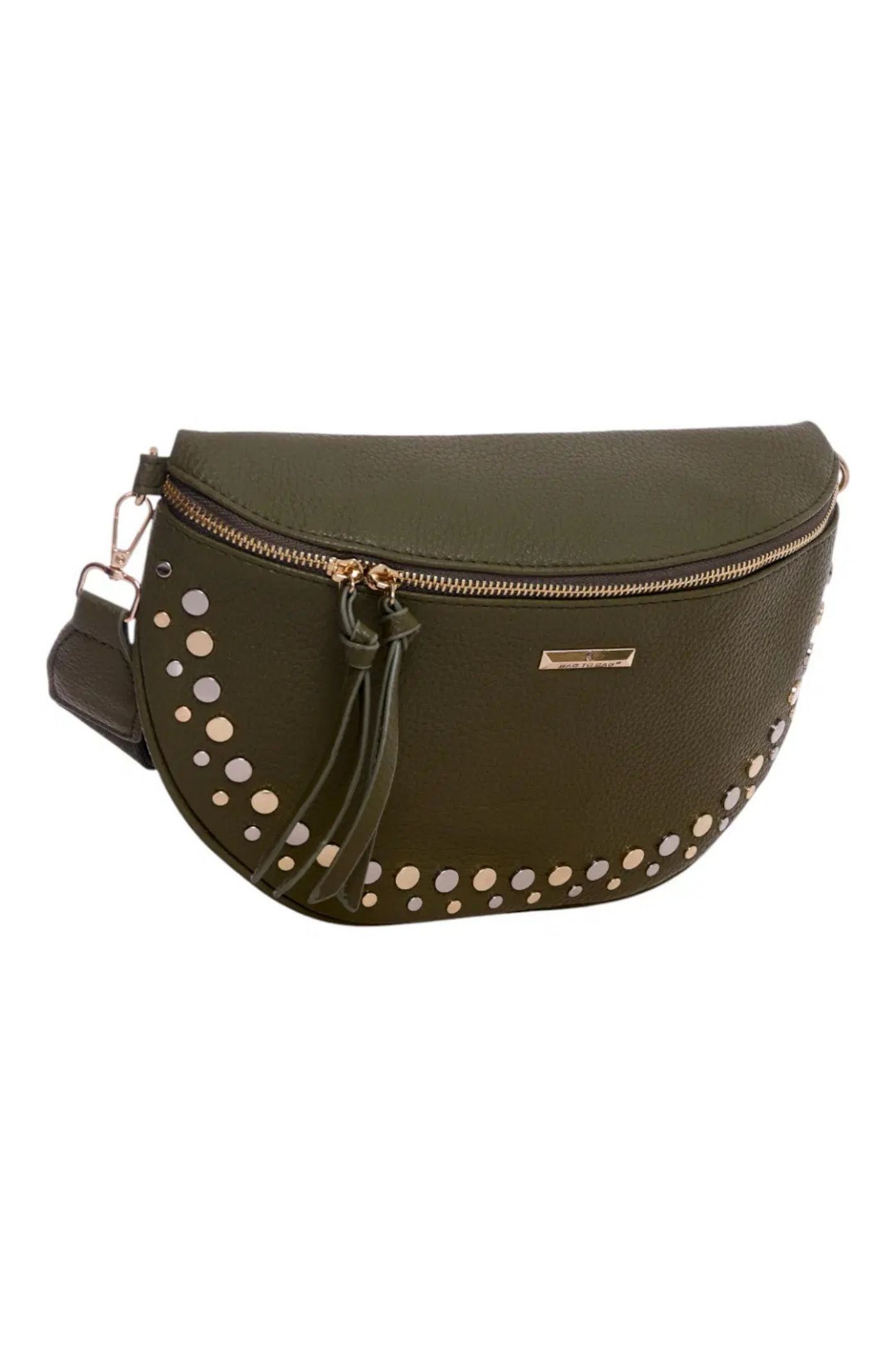 Αναβάθμισε τις καθημερινές σου εμφανίσεις με τη στιλάτη γυναικεία τσάντα μέσης / χιαστή, σχεδιασμένη για άνεση και πρακτικότητα . Κατασκευασμένη από υψηλής ποιότητας υλικό με ανάγλυφη υφή, προσφέρει αντοχή και κομψότητα σε κάθε look. Διαθέτει διπλό φερμουάρ για καλύτερη οργάνωση και άμεση πρόσβαση στα προσωπικά σου αντικείμενα, ενώ η διακόσμηση με μεταλλικά τρουκς σε χρυσούς και ασημί τόνους της χαρίζει εντυπωσιακό, μοντέρνο χαρακτήρα. Ο ρυθμιζόμενος ιμάντας επιτρέπει άνετη εφαρμογή στη μέση ή χιαστή, καθιστώντας την ιδανική για βόλτες, ταξίδια και καθημερινή χρήση. Μια ευέλικτη, ξεχωριστή τσάντα που συνδυάζει λειτουργικότητα και στυλ.