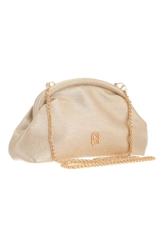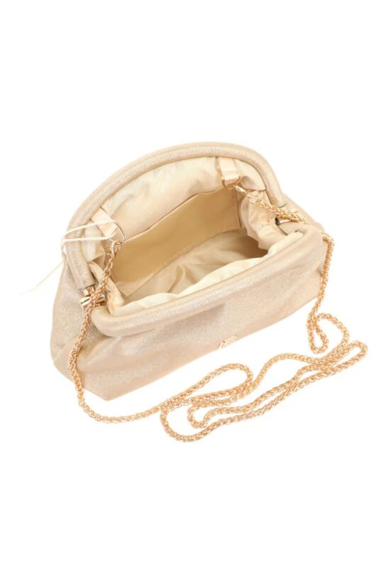Αυτή η γυναικεία βραδινή τσάντα ξεχωρίζει για την μοντέρνα, πουγκί/μαζεμένη (pouch) γραμμή της, που ακολουθεί τις τελευταίες τάσεις της μόδας. Το υλικό της έχει μια υπέροχη μεταλλική (metallic) υφή, προσφέροντας διακριτική λάμψη. Η τσάντα-πουγκί διαθέτει μια λεπτή, χρυσή αλυσίδα, η οποία σας επιτρέπει να τη φορέσετε στον ώμο ή χιαστί, αφήνοντας τα χέρια σας ελεύθερα. Μπορείτε φυσικά να την κρύψετε στο εσωτερικό της και να την κρατήσετε ως χειροποίητο φάκελο (handheld clutch). Η ευρύχωρη και μαλακή της φόρμα είναι πρακτική για τα απαραίτητα βραδινά σας αντικείμενα.
