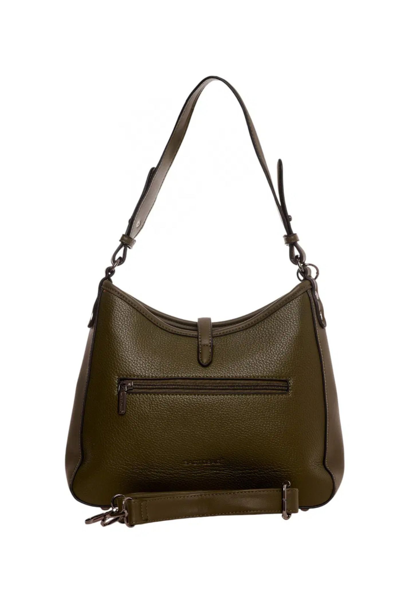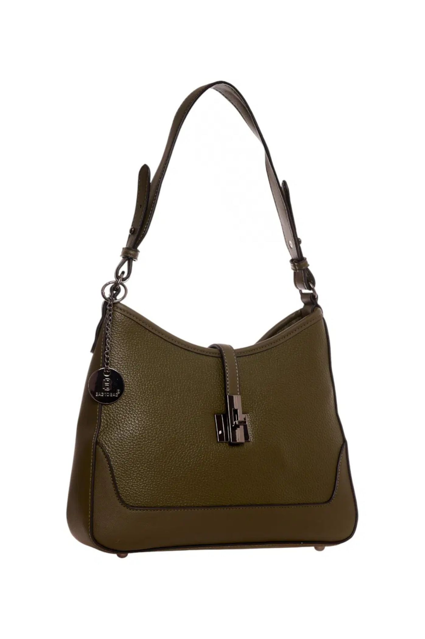 Αναδείξτε το στυλ σας με την τσάντα ώμου που συνδυάζει την κλασική αισθητική με τη μοντέρνα λεπτομέρεια. Αυτή η στυλάτη γυναικεία τσάντα είναι κατασκευασμένη από υψηλής ποιότητας δερματίνη με υπέροχη ανάγλυφη υφή, προσφέροντας μια luxurious αίσθηση. Το σχήμα της είναι μισοφέγγαρο με σταθερή βάση, καθιστώντας την ευρύχωρη και πρακτική. Η τσάντα διαθέτει ένα εντυπωσιακό μεταλλικό κούμπωμα ασφαλείας στο μπροστινό μέρος, προσθέτοντας μια statement πινελιά. Το ρυθμιζόμενο λουρί ώμου επιτρέπει άνετη εφαρμογή, ενώ η μεταλλική λεπτομέρεια με το λογότυπο στο πλάι ολοκληρώνει το εκλεπτυσμένο design. Ιδανική για το γραφείο, μια κομψή βραδινή έξοδο ή τις φθινοπωρινές εμφανίσεις σας.