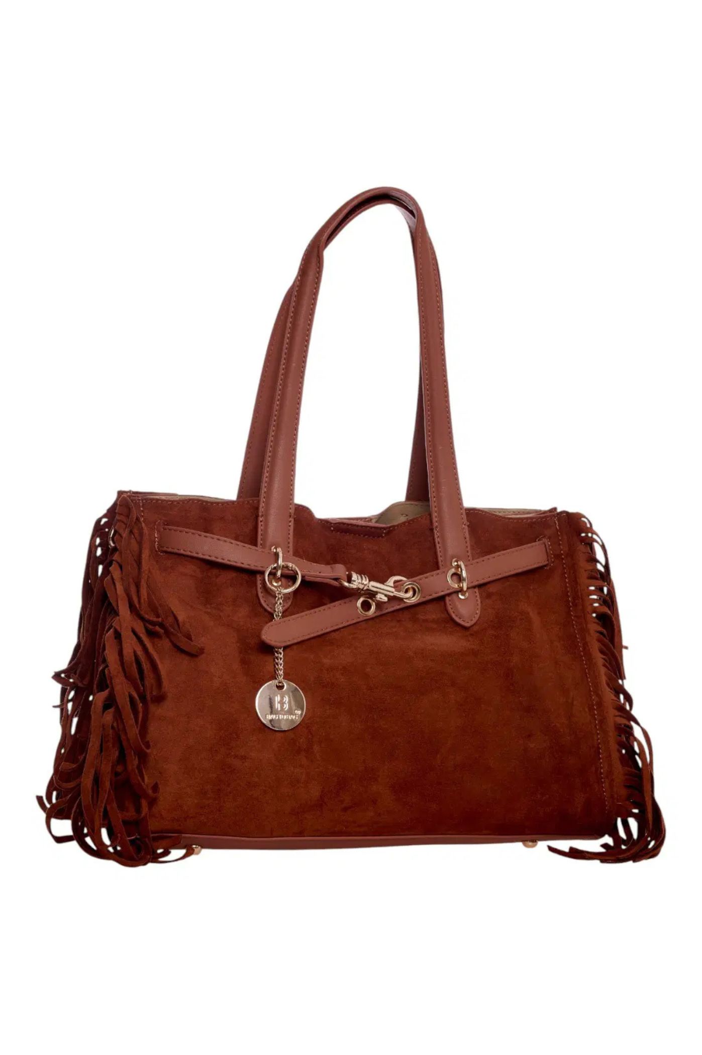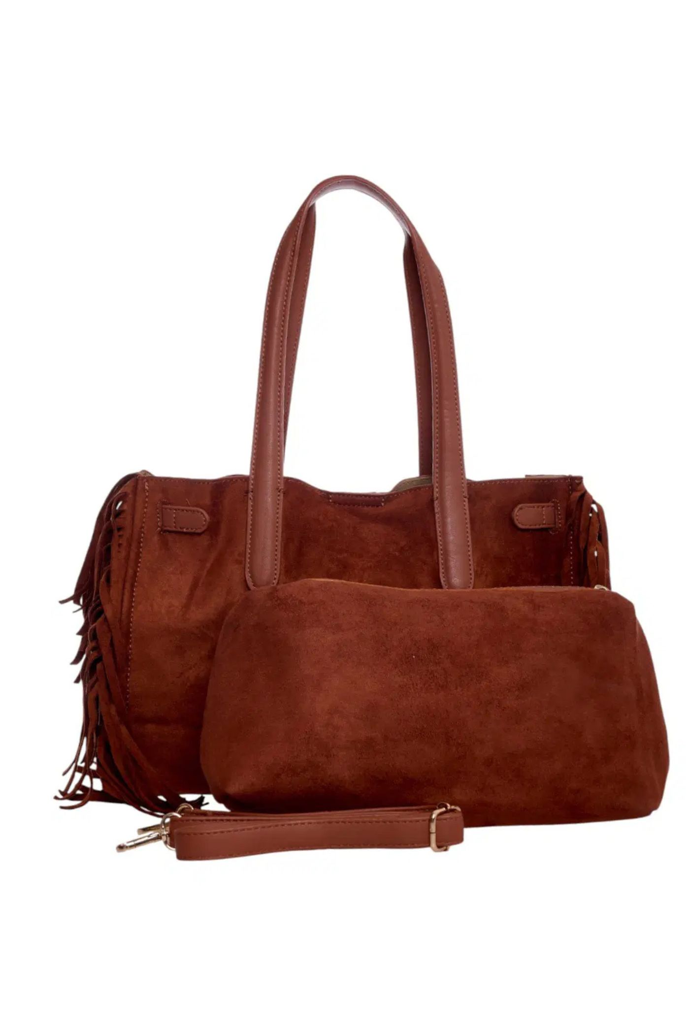 Αναδείξτε το στυλ σας με την πιο μοντέρνα γυναικεία τσάντα ώμου της σεζόν! Αυτή η τσάντα συνδυάζει την αίσθηση του καστόρ με την παιχνιδιάρικη διάθεση των κροσιών στα πλαϊνά, δημιουργώντας ένα απόλυτα boho-chic αποτέλεσμα. Το ιδιαίτερο μεταλλικό κούμπωμα στο μπροστινό μέρος, εκτός από διακοσμητικό στοιχείο, προσθέτει μια νότα πολυτέλειας και εξασφαλίζει το κλείσιμο με στυλ. Το μοναδικό χαρακτηριστικό αυτής της τσάντας είναι το αποσπώμενο τσαντάκι που περιλαμβάνεται. Μπορείτε να το χρησιμοποιήσετε ως νεσεσέρ, πορτοφόλι. Η μεγάλη τσάντα είναι αρκετά ευρύχωρη για να χωρέσει όλα τα καθημερινά σας αντικείμενα.