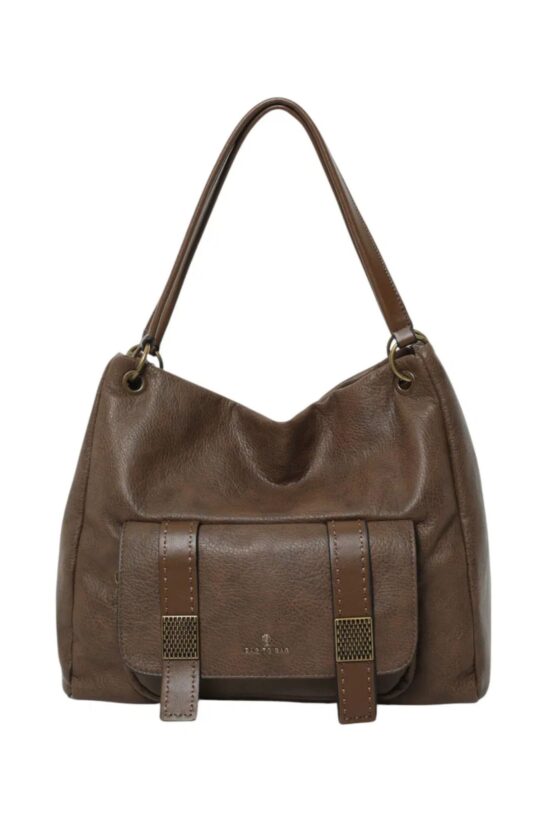 Αναδείξτε το καθημερινό σας στυλ με αυτή την κομψή και πρακτική γυναικεία τσάντα ώμου. Η τσάντα διαθέτει μια ευρύχωρη κεντρική θήκη που κλείνει με φερμουάρ, ενώ στο μπροστινό μέρος ξεχωρίζει μια εξωτερική θήκη με διακοσμητικά λουράκια και μεταλλικές αγκράφες, προσφέροντας εύκολη πρόσβαση στα απαραίτητα αντικείμενα σας. Οι ανθεκτικές λαβές για τον ώμο προσφέρουν άνετη εφαρμογή, ενώ ο μεταλλικός κρίκος στο χερούλι προσθέτει μια μοναδική λεπτομέρεια στο στυλ της. Κατασκευασμένη από υψηλής ποιότητας συνθετικό δέρμα, είναι ανθεκτική στη χρήση και εύκολη στον καθαρισμό. Συνδυάστε την με casual ή πιο επίσημα σύνολα και προσθέστε μια πινελιά κομψότητας στην εμφάνισή σας.