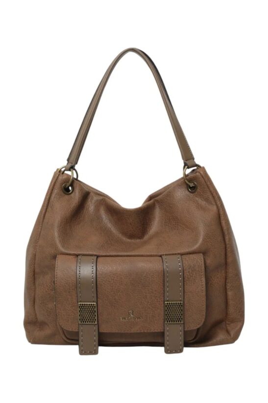 Αναδείξτε το καθημερινό σας στυλ με αυτή την κομψή και πρακτική γυναικεία τσάντα ώμου. Η τσάντα διαθέτει μια ευρύχωρη κεντρική θήκη που κλείνει με φερμουάρ, ενώ στο μπροστινό μέρος ξεχωρίζει μια εξωτερική θήκη με διακοσμητικά λουράκια και μεταλλικές αγκράφες, προσφέροντας εύκολη πρόσβαση στα απαραίτητα αντικείμενα σας. Οι ανθεκτικές λαβές για τον ώμο προσφέρουν άνετη εφαρμογή, ενώ ο μεταλλικός κρίκος στο χερούλι προσθέτει μια μοναδική λεπτομέρεια στο στυλ της. Κατασκευασμένη από υψηλής ποιότητας συνθετικό δέρμα, είναι ανθεκτική στη χρήση και εύκολη στον καθαρισμό. Συνδυάστε την με casual ή πιο επίσημα σύνολα και προσθέστε μια πινελιά κομψότητας στην εμφάνισή σας.