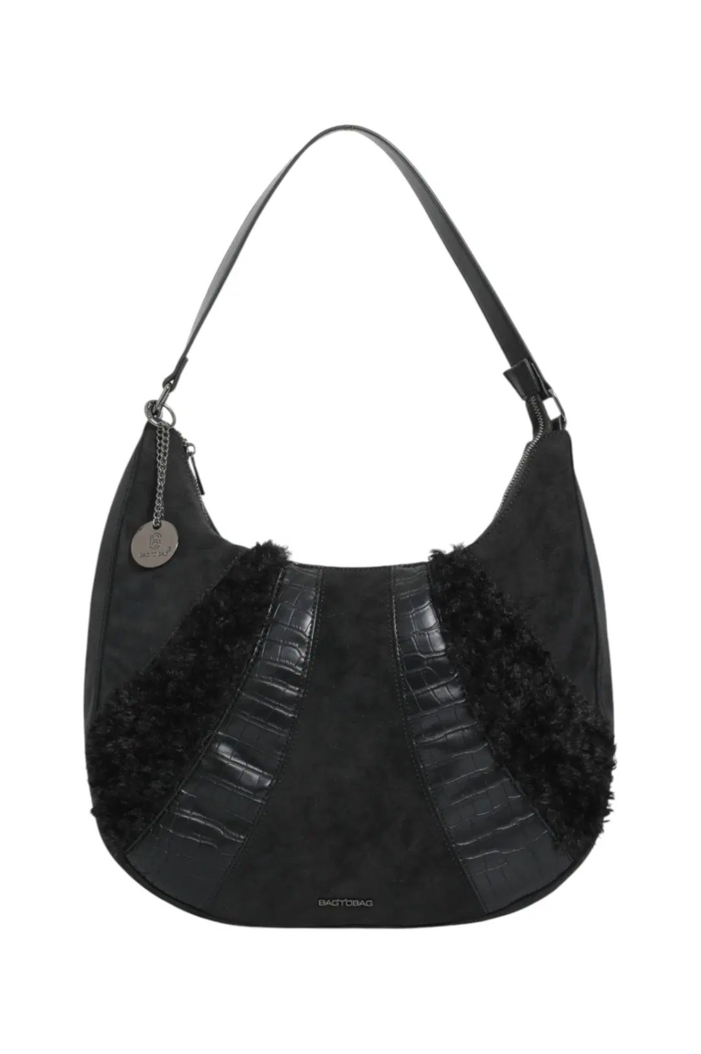 Αυτή η εντυπωσιακή τσάντα ώμου  συνδυάζει άψογα διαφορετικές υφές, δημιουργώντας ένα μοναδικό και κομψό αξεσουάρ. Οι λεπτομέρειες από δερματίνη με ανάγλυφο σχέδιο και οι απαλές γούνινες πινελιές προσδίδουν πολυτέλεια και στυλ.