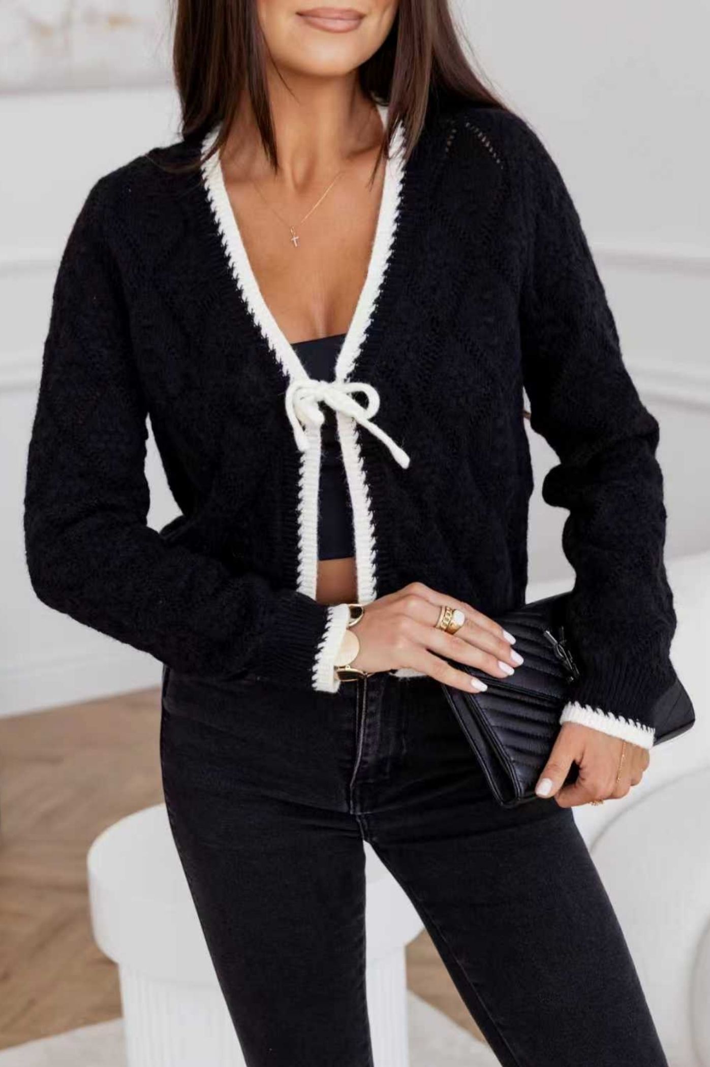 Αποκτήστε ένα διαχρονικό και ταυτόχρονα μοντέρνο πλεκτό κομμάτι με αυτή τη ζακέτα crop. Η ζακέτα ξεχωρίζει για το ιδιαίτερο σχέδιο πλέξης της, που προσθέτει υφή και βάθος. Το βασικό στοιχείο του design είναι το δέσιμο με λευκό φιόγκο στο μπούστο, που χαρίζει ένα θηλυκό και preppy ύφος. Οι λευκές ρέλιες που τονίζουν το περίγραμμα της λαιμόκοψης, του στριφώματος και των μανσετών, δημιουργούν μια εντυπωσιακή αντίθεση, αναδεικνύοντας το ρούχο. Ιδανική για layering πάνω από τοπ ή φορέματα.
