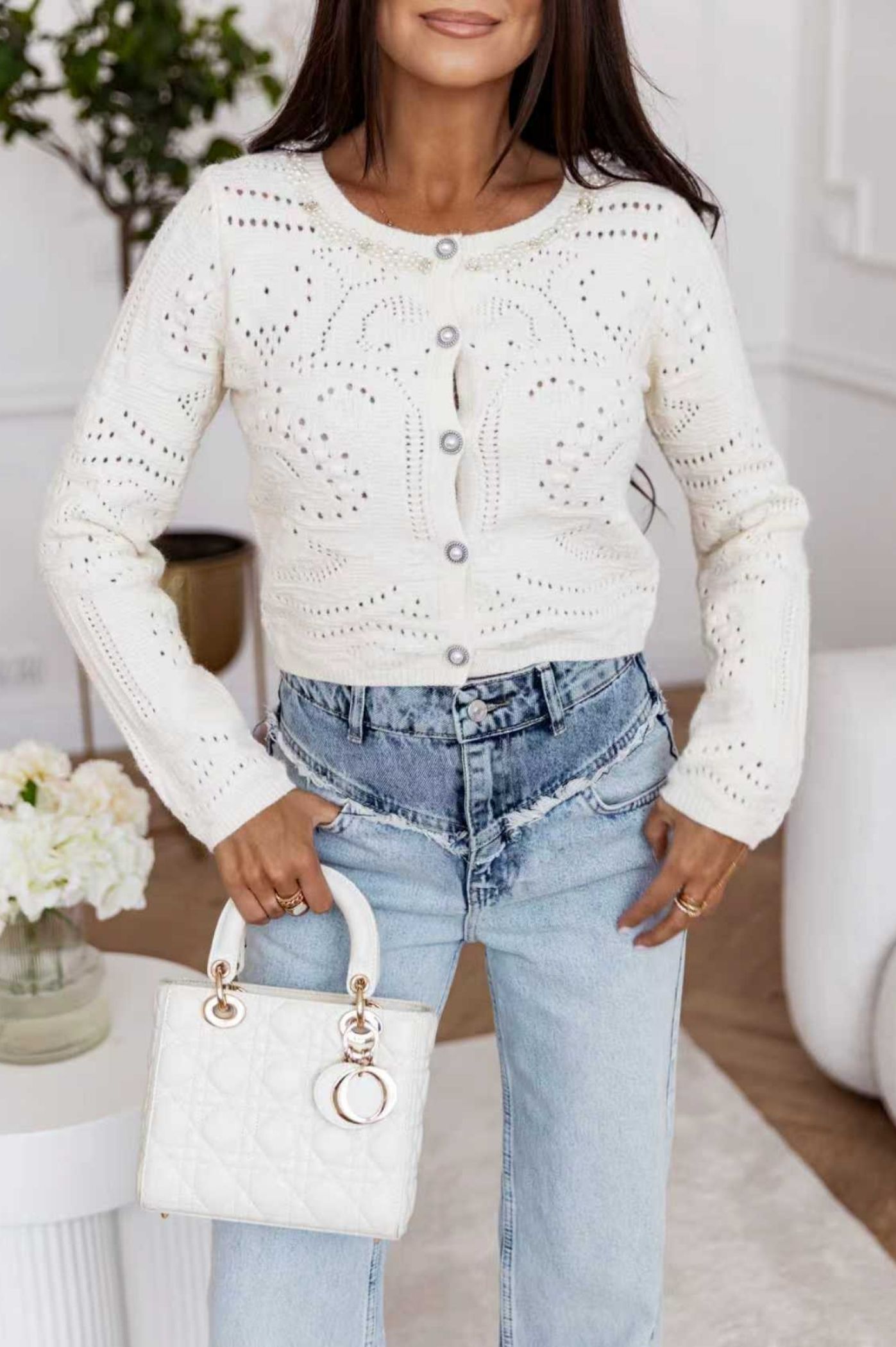 Αναδείξτε το στυλ σας με αυτή την ρομαντική πλεκτή ζακέτα. Η ζακέτα ξεχωρίζει για το λεπτό και περίτεχνο διάτρητο σχέδιο σε όλη την επιφάνεια. Το στοιχείο που την κάνει μοναδική είναι η διακριτική διακόσμηση με πέρλες γύρω από τη λαιμόκοψη, προσθέτοντας λάμψη και κομψότητα. Τα κουμπιά είναι επίσης διακοσμημένα με πέρλες, ενισχύοντας το elegant και chic ύφος. Η γραμμή της είναι cropped, ιδανική για να αναδείξει ψηλόμεσα παντελόνια ή φούστες.