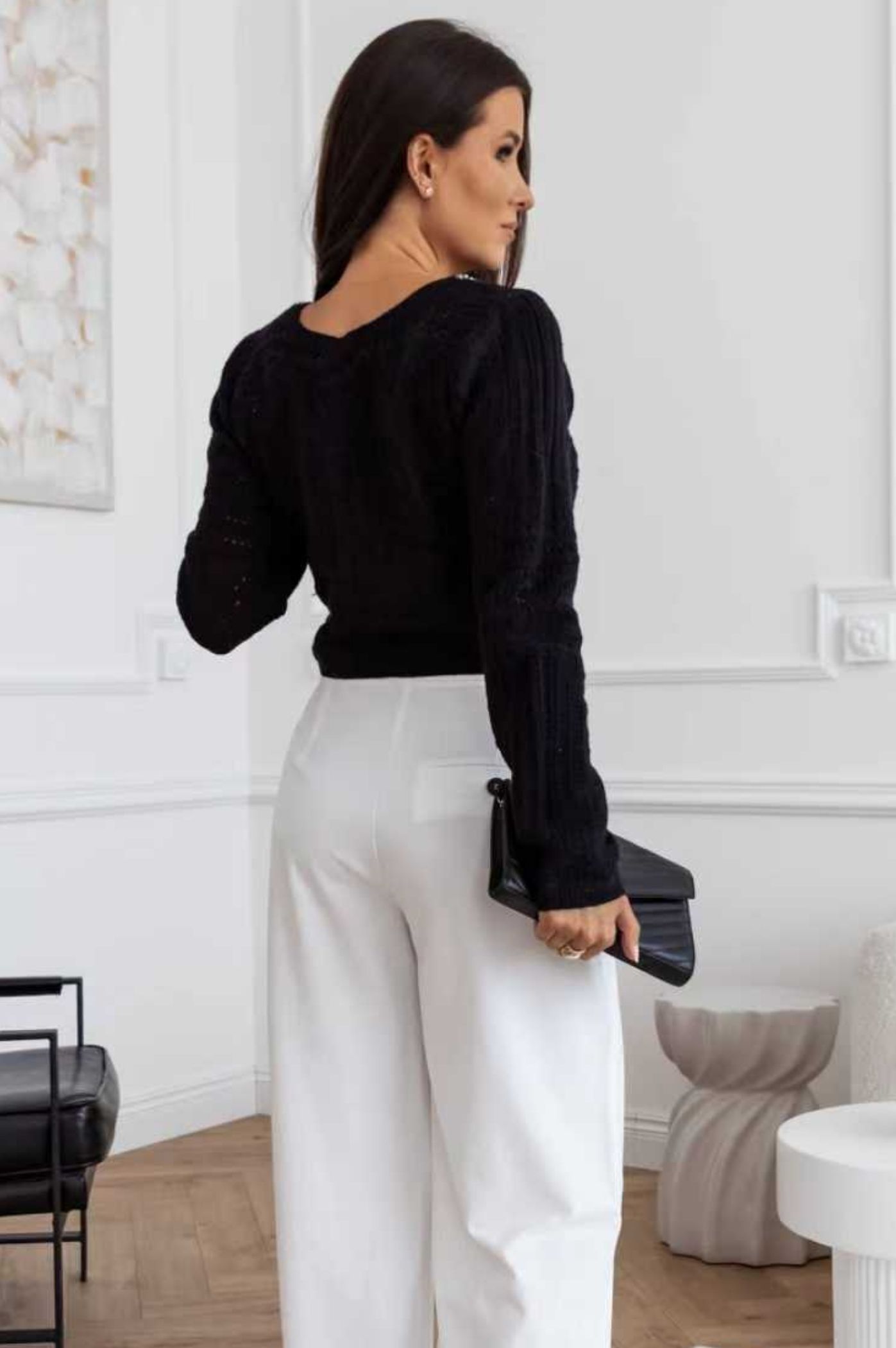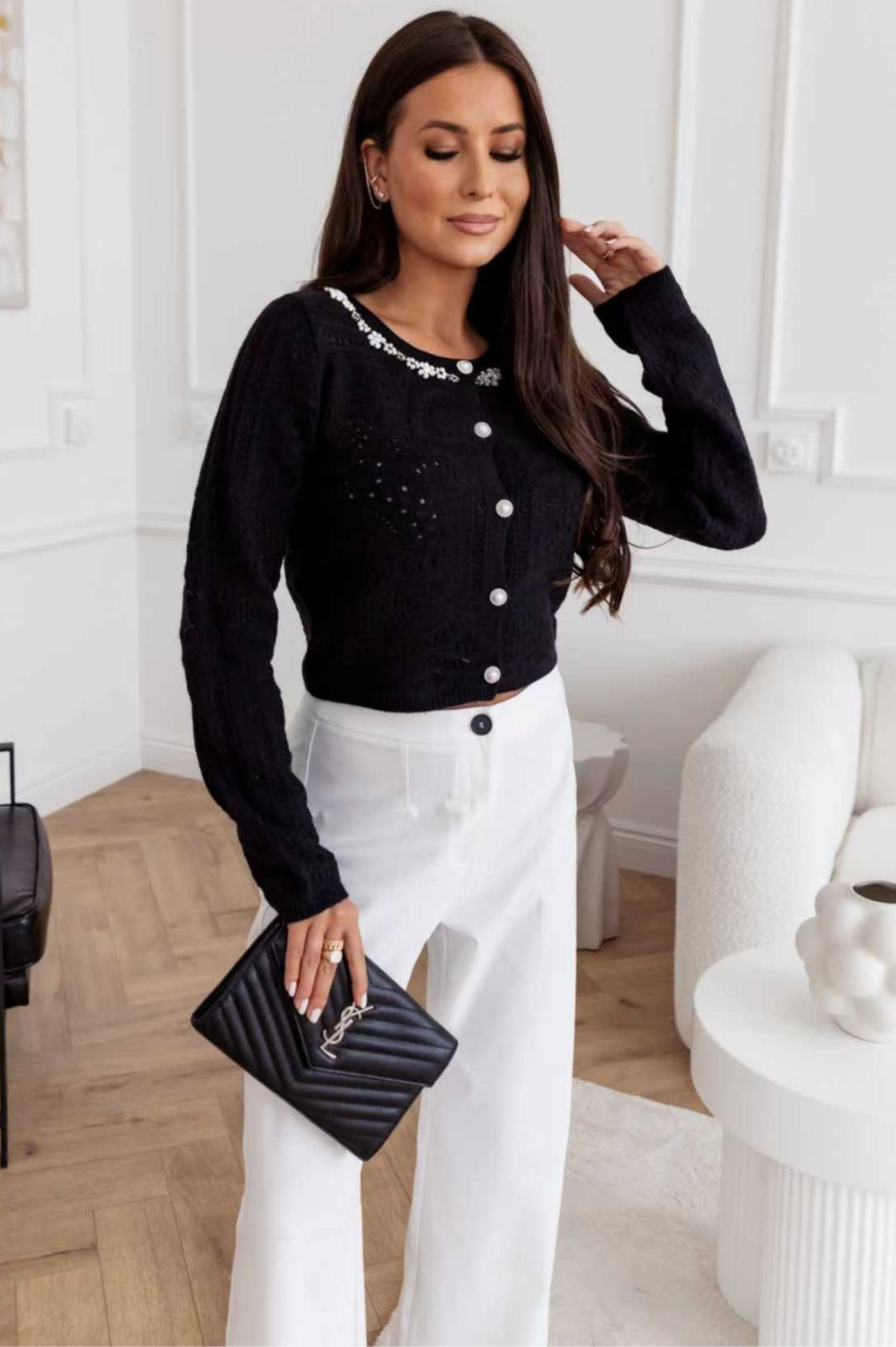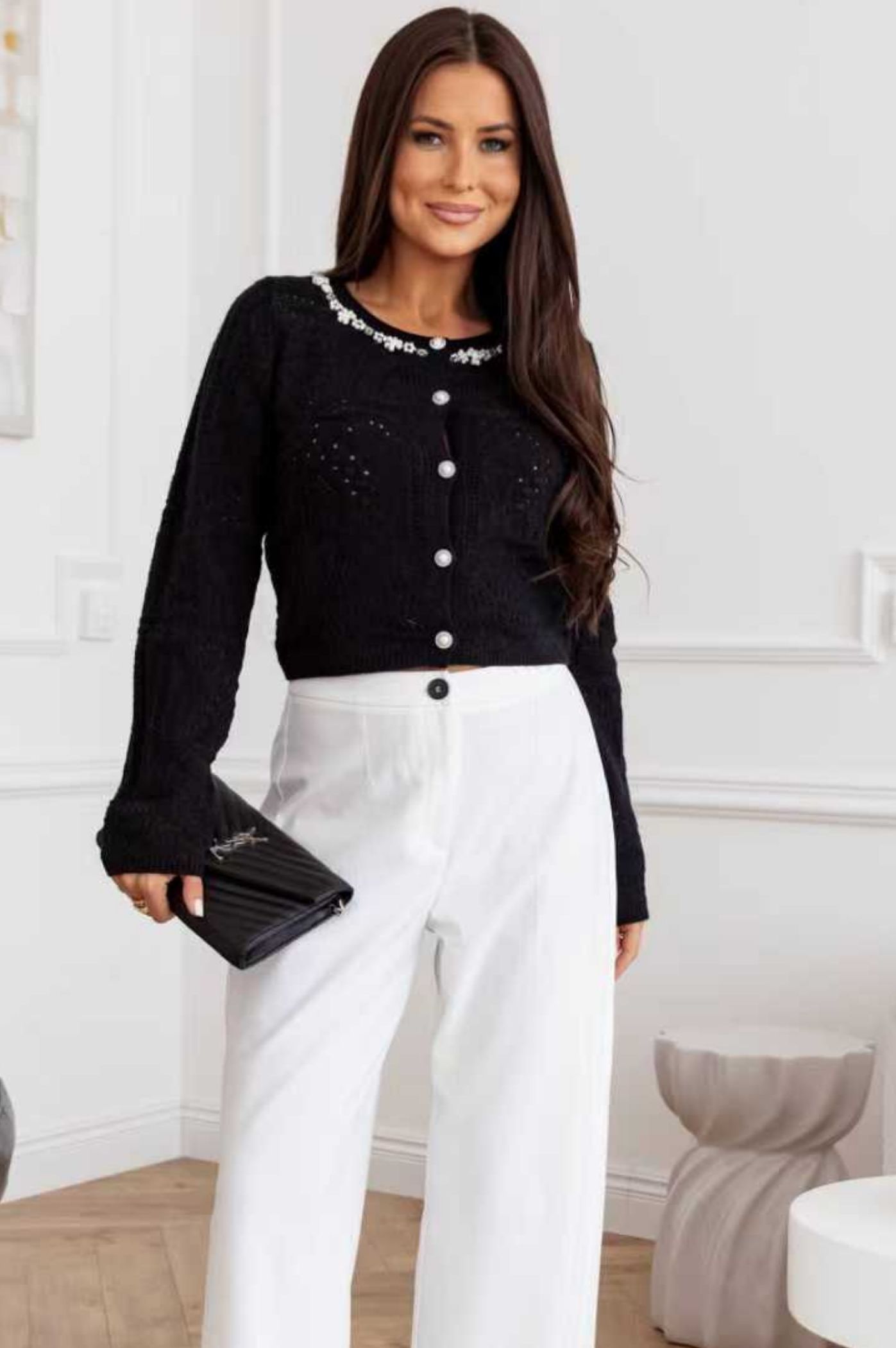 Αναδείξτε το στυλ σας με αυτή την ρομαντική πλεκτή ζακέτα. Η ζακέτα ξεχωρίζει για το λεπτό και περίτεχνο διάτρητο σχέδιο σε όλη την επιφάνεια. Το στοιχείο που την κάνει μοναδική είναι η διακριτική διακόσμηση με πέρλες γύρω από τη λαιμόκοψη, προσθέτοντας λάμψη και κομψότητα. Τα κουμπιά είναι επίσης διακοσμημένα με πέρλες, ενισχύοντας το elegant και chic ύφος. Η γραμμή της είναι cropped, ιδανική για να αναδείξει ψηλόμεσα παντελόνια ή φούστες.