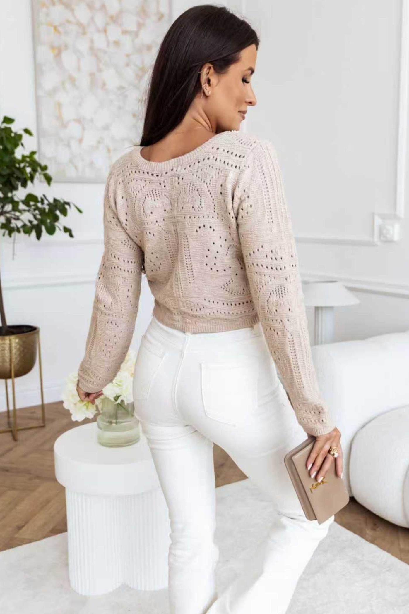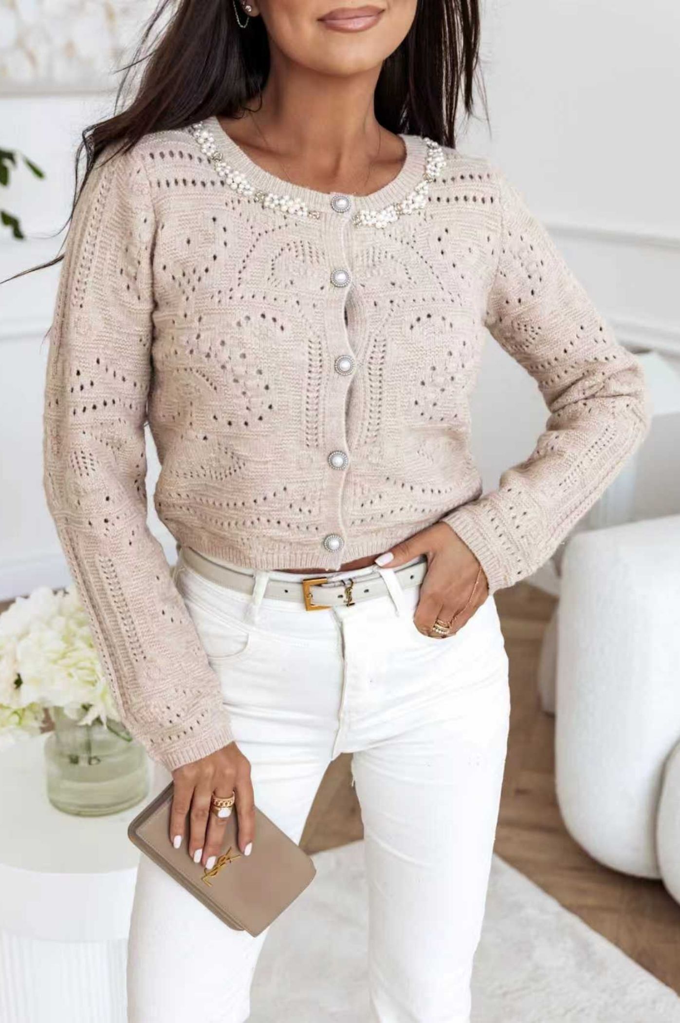 Αναδείξτε το στυλ σας με αυτή την ρομαντική πλεκτή ζακέτα. Η ζακέτα ξεχωρίζει για το λεπτό και περίτεχνο διάτρητο σχέδιο σε όλη την επιφάνεια. Το στοιχείο που την κάνει μοναδική είναι η διακριτική διακόσμηση με πέρλες γύρω από τη λαιμόκοψη, προσθέτοντας λάμψη και κομψότητα. Τα κουμπιά είναι επίσης διακοσμημένα με πέρλες, ενισχύοντας το elegant και chic ύφος. Η γραμμή της είναι cropped, ιδανική για να αναδείξει ψηλόμεσα παντελόνια ή φούστες.
